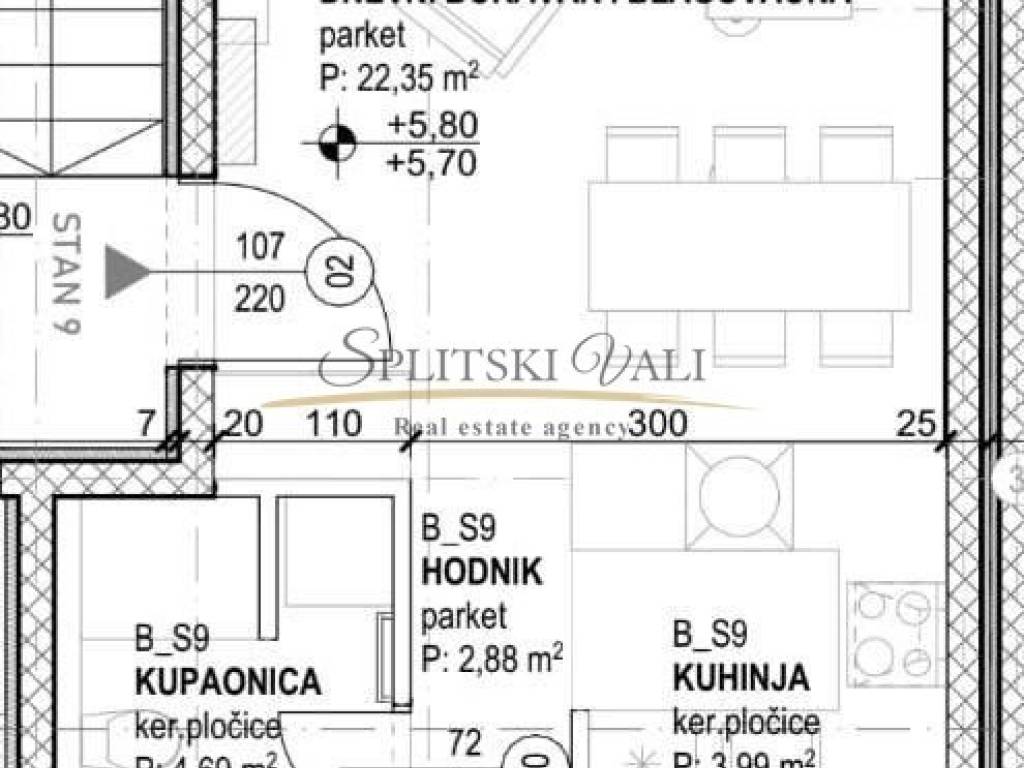 STAN B9 položen na drugom katu stambene zgrade, prostire se na 53,82 m2, a sastoji se od kuhinje s blagovaonicom, dnevne sobe, dvije spavaće sobe, kupatila i 5,6 m2 loggie.