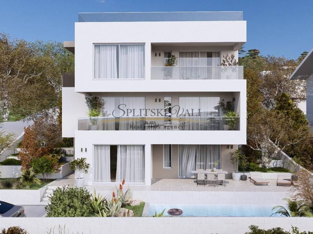 Iz dnevnog dijela pruža se izlaz na natkrivenu terasu od 30,13 m i uređeno dvorište površine 202,35 m, u kojem se nalazi privatni bazen (19,11 m) i vanjski tuš. Stanu pripadaju dva parkirna mjesta, od kojih je jedno uključeno u cijenu.