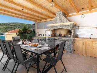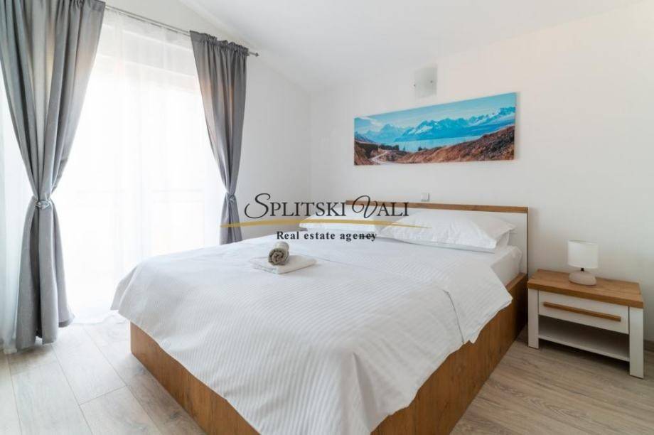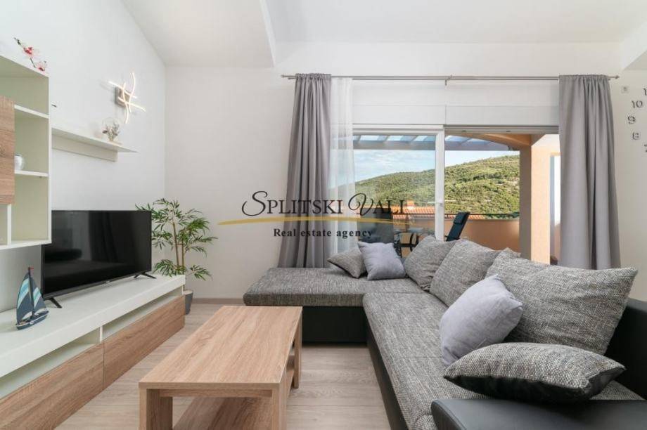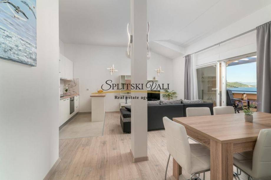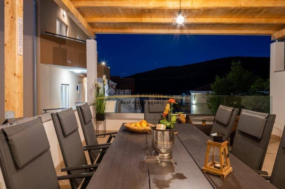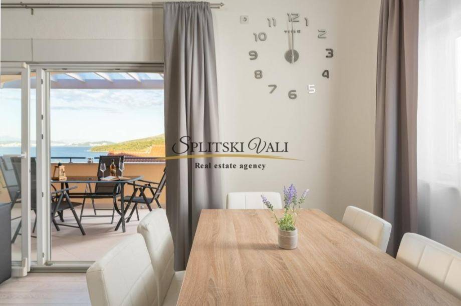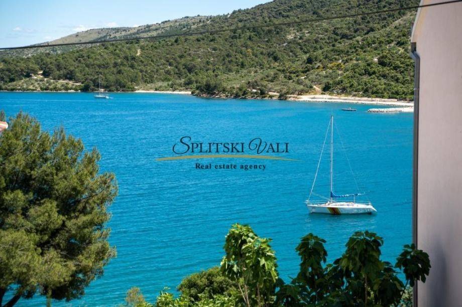 Na prodaju je atraktivna apartmanska kuća smještena u mirnom i lijepo uređenom dijelu mjesta Marina, nedaleko od Trogira. Udaljena je svega 70 metara od mora te 500 metara od centra mjesta, što je čini idealnom prilikom za turističku investiciju ili za ugodan obiteljski život uz more.