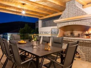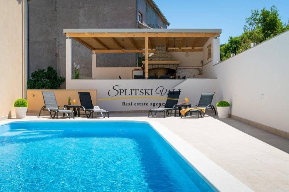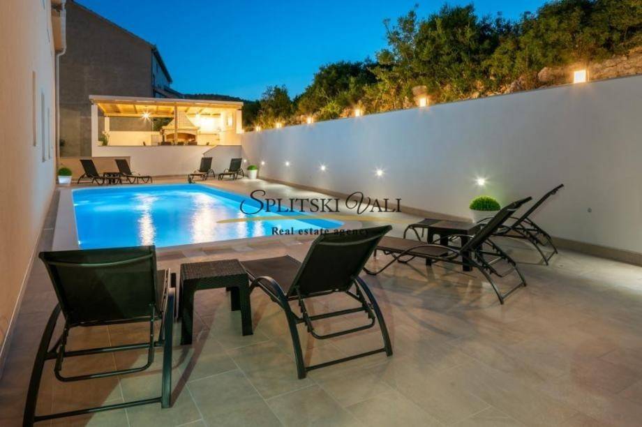 U dvorištu se nalazi privatni bazen dimenzija 10 x 4 metra, okružen velikim sunčalištem površine 200 m. Uz bazen je smještena natkrivena terasa s vanjskim kaminom i prostorom za druženje, vanjski tuš te dodatna tehnička prostorija s kupaonicom, što dodatno povećava funkcionalnost prostora.
