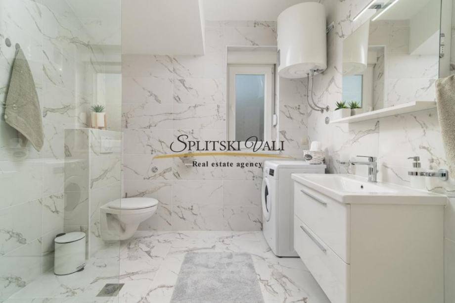 U prizemlju se nalaze dva prostrana dvosobna apartmana, svaki površine oko 55 m, s izlazom na veliku terasu idealnu za opuštanje i druženje na otvorenom. U suterenu su smještene dvije konobe, svaka površine 40 m, koje nude brojne mogućnosti prenamjene u wellness zonu, prostor za igru, spremište ili dodatni sadržaj prema potrebi budućeg vlasnika.