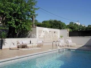Sul cortile paesaggistico e recintato di 332 mq si trovano due posti auto, una piscina di 24 mq (8x3 m) e un locale ausiliario che può fungere da taverna, ripostiglio o centro benessere.