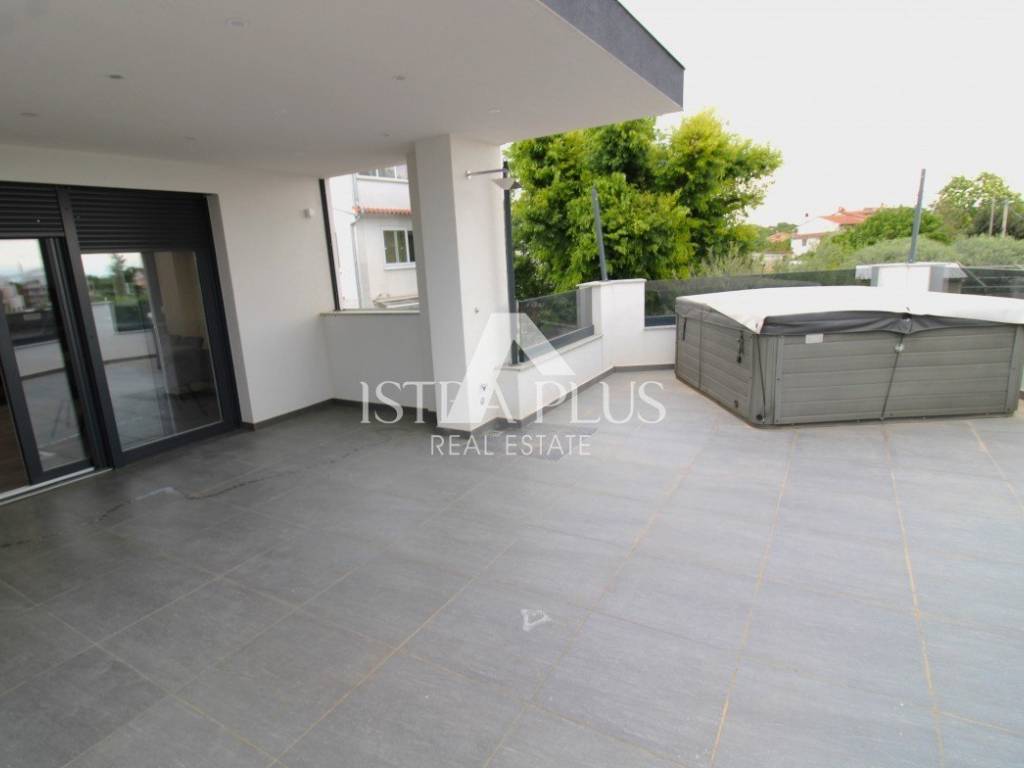 S207 Un lussuoso appartamento al 1 piano con una grande terrazza, jacuzzi e sauna si trova a 5 km dalle prime spiagge e da Parenzo. L'appartamento di 65 mq, è composto da ingresso, 2 camere da letto, 2 bagni, lavanderia/ripostiglio, ampia cucina con sala da pranzo e soggiorno da cui si accede ad un ampio terrazzo parzialmente coperto di 14 mq, che può essere utilizzato come zona relax. L'appartamento è dotato di riscaldamento a pavimento, aria condizionata e camino nel soggiorno. L'appartamento è dotato di piastrelle di alta qualità, mobili su misura e sauna e jacuzzi sulla terrazza. L'appartamento dispone di due posti auto davanti al palazzo dotati di presa. Tutti i contenuti necessari per la vita si trovano nelle immediate vicinanze.