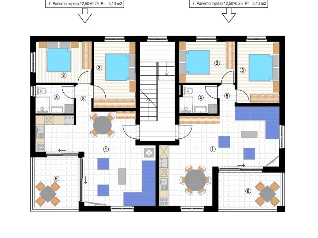 Available Apartments: Ground Floor Apartment (PP) 69.65 m + garden 97.00 m Price: 264,000 Apartment S1 69.49 m + garden 41.00 m Price: 252,000 Apartment S2 69.18 m Price: 259,000 Apartment S3 69.03 m Price: 259,000 Apartment S4 99.47 m Price: 397,000 CONSTRUCTION AND FINISHING STANDARDS STRUCTURE: The load-bearing structure consists of a reinforced concrete frame system with POROTHERM load-bearing brick blocks (25 cm) on reinforced concrete strip foundations Partition walls: POROTHERM brick blocks (12 cm) Floor structure: reinforced concrete slab (18 cm) + 4 cm thermal insulation + 5 cm cement screed + final floor covering FAÇADE: ETICS thermal façade system with EPS panels, thickness 810 cm EXTERNAL DOORS AND WINDOWS: PVC Aluplast profiles, smooth gray color on both sides Double-glazed windows: IZO 4 float 16/4 Low-E, 24 mm ALU sliding doors: Schuco Thermally insulated aluminum shutters with motorized control and wall switch Aluminum entrance doors, burglar- and fire-resistant, with sound and thermal insulation COMMON AREAS: Entrance and staircase floors finished with stone tiles BATHROOMS: Waterproofing of all floors and partially of walls Geberit built-in cisterns, the latest generation quiet, hygienic, and highly reliable, with only the flush plate visible Electric underfloor heating in all bathrooms Anti-slip ceramic tiles for floors and walls WALLS & CEILINGS: Final wall and ceiling treatment with cement-lime plaster, smoothed and painted with semi-dispersion white paint MECHANICAL INSTALLATIONS Water & Drainage: Separate water meters for each apartment located in a dedicated water meter shaft Water installations with PPR pipes Drainage verticals made with low-noise pipes to reduce sound transmission Heating & Cooling: Multi-split inverter air-conditioning system for heating and cooling all living rooms and bedrooms Outdoor units placed on the rooftop Ventilation: Combination of mechanical and natural ventilation in bathrooms ELECTRICAL INSTALLATIONS: LED lighting throughout the apartments LED staircase lighting LED exterior lighting and ambient LED lighting for outdoor areas Pre-installations for antenna and telephone connections