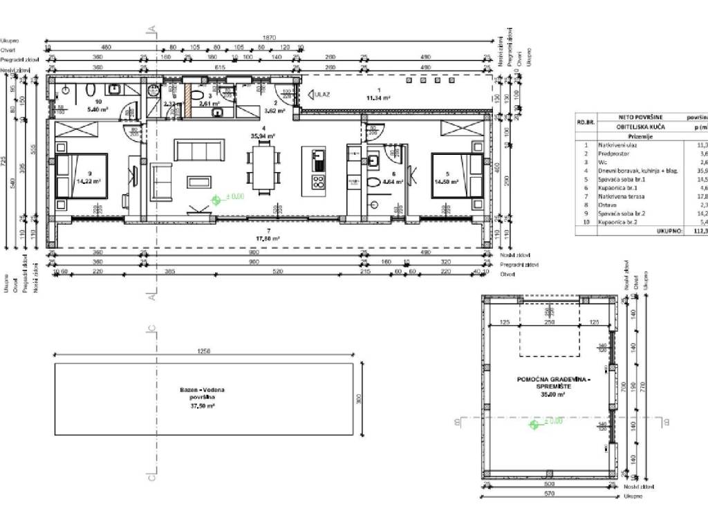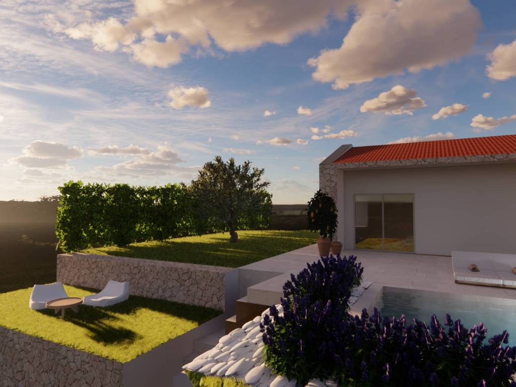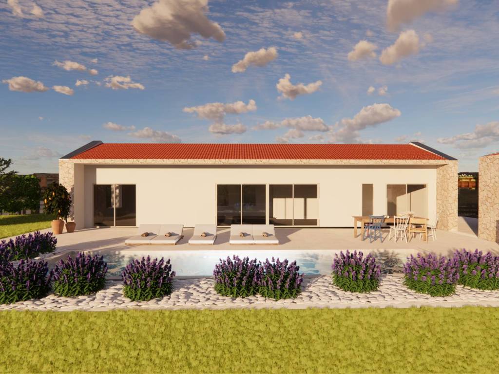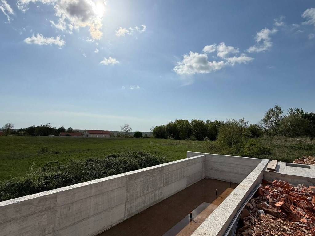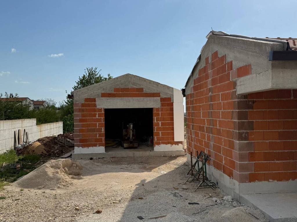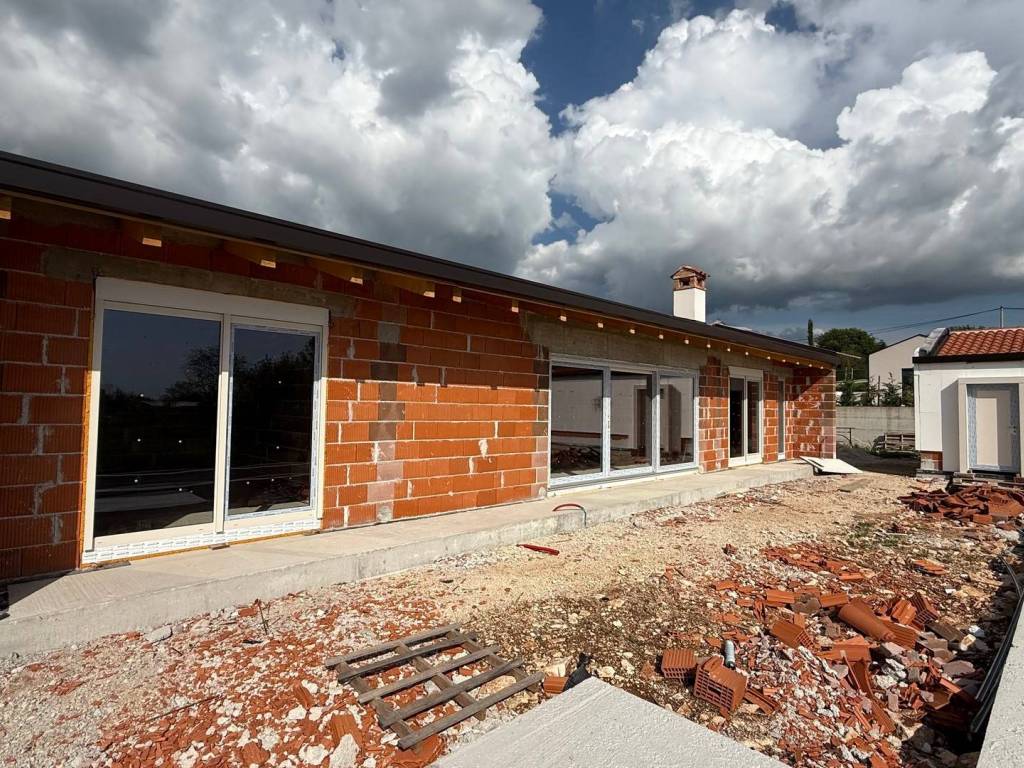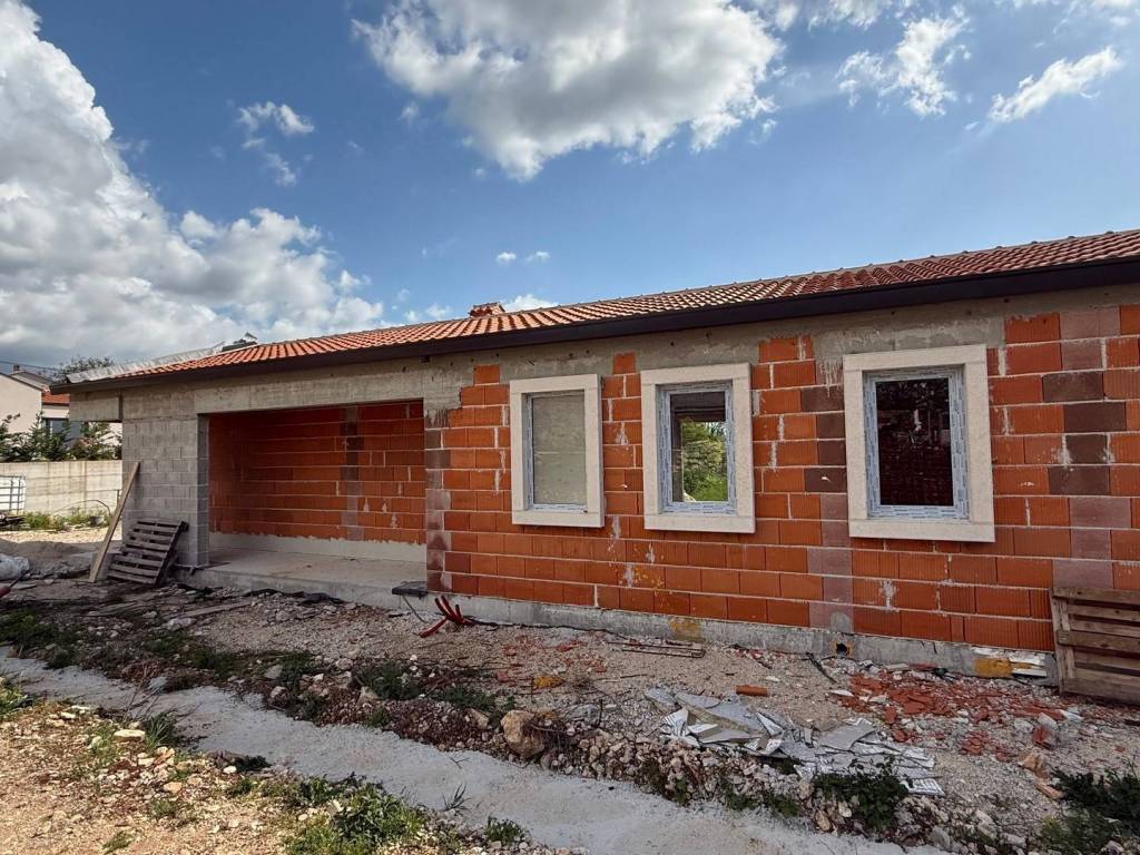 Excellent single-storey house on a spacious plot located near Tinjan. The house with an area of 115 m2 consists of an entrance hall, a spacious living room with kitchen and dining room, a hallway, two bedrooms with private bathrooms, a toilet, a storage room and a terrace. Next to the house there is an auxiliary building with an area of 40 m2 that can be adapted to different need