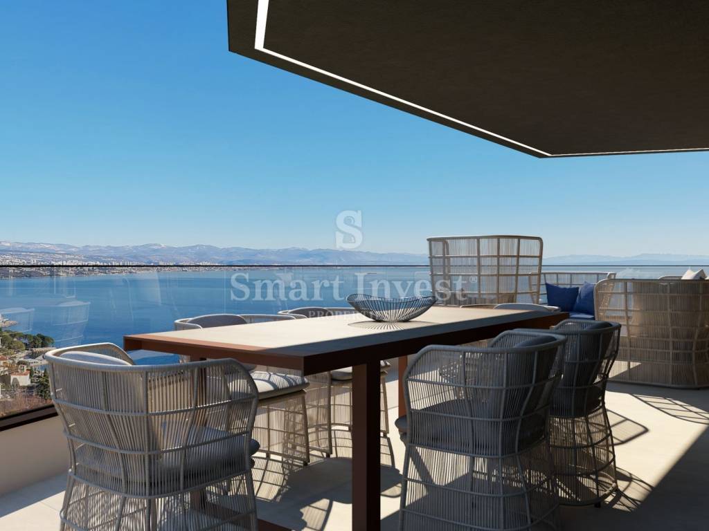 This apartment offers you the ultimate comfort, top-quality equipment and a spectacular view of the sea. At your disposal are an entrance, storage room, 3 comfortable bedrooms with en-suite bathrooms, and a spacious living room with kitchen and dining room that extends towards the large terrace with a fantastic view of the sea and Opatija.