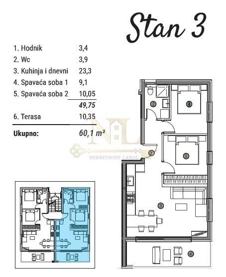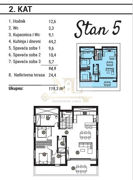 Penthouse apartment S5 second floor consists of: 3 bedrooms, hallway, bathroom, separate toilet, kitchen and dining room and large terrace.