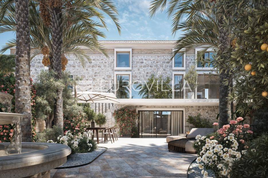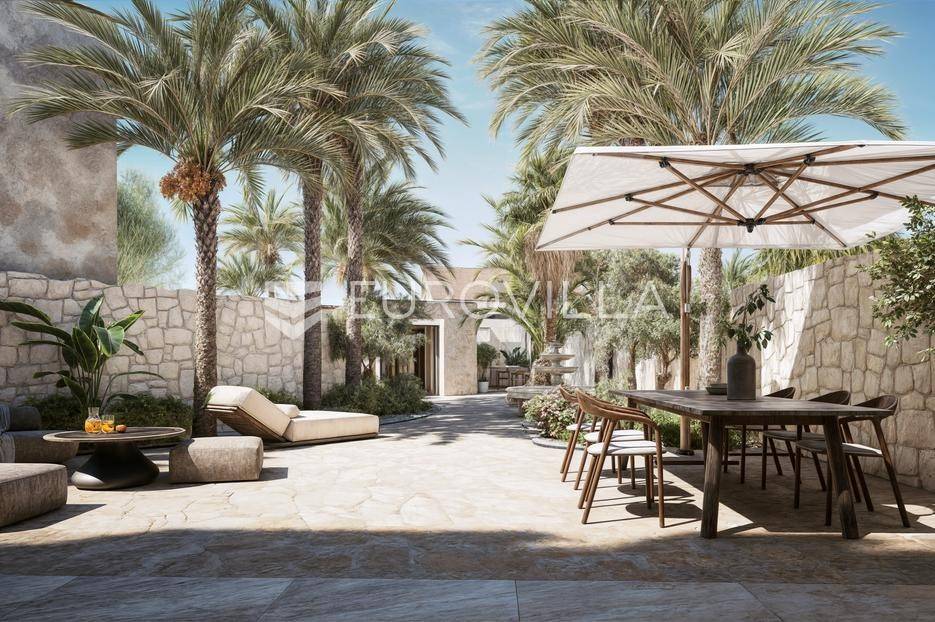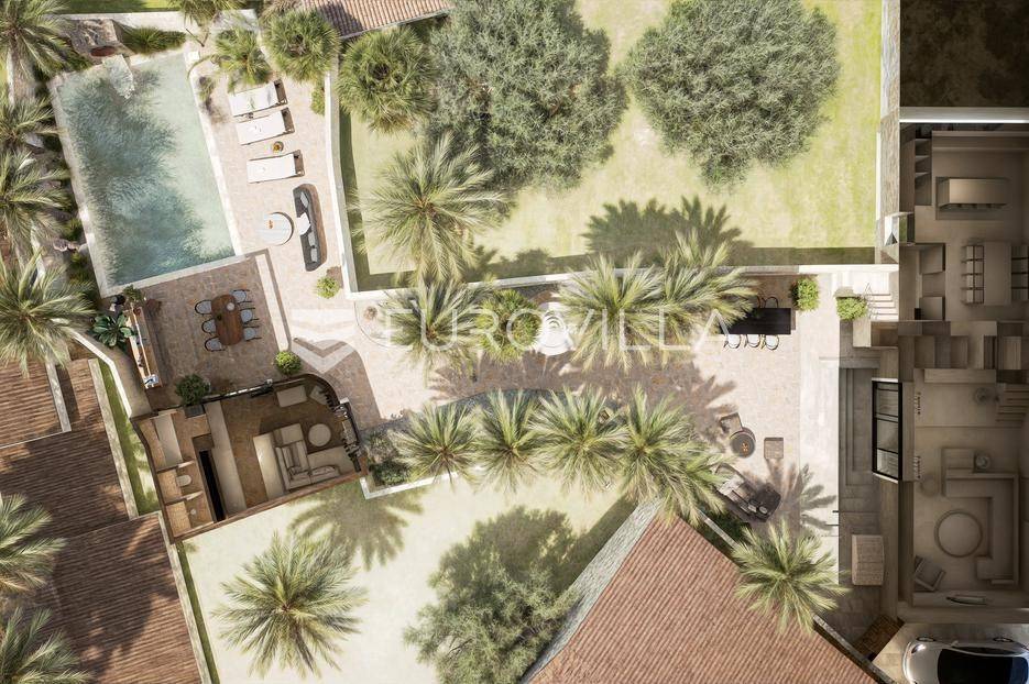 Imanje se može pohvaliti zamršenim kamenim skulpturama i kamenom fontanom koja doprinosi njegovoj povijesnoj privlačnosti. Dvorište od 500 četvornih metara privatna je oaza s luksuznim bazenom i vanjskom kuhinjom, savršeno za zabavu ili mirno opuštanje. Okruženo bujnim palmama i živahnim bugenvilijama, dvorište nije samo prostor, već zadivljujuće utočište koje privlači sva osjetila.