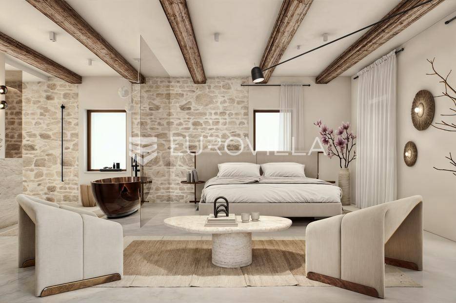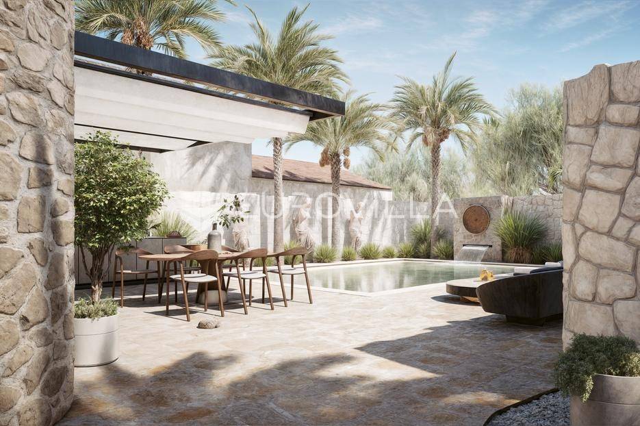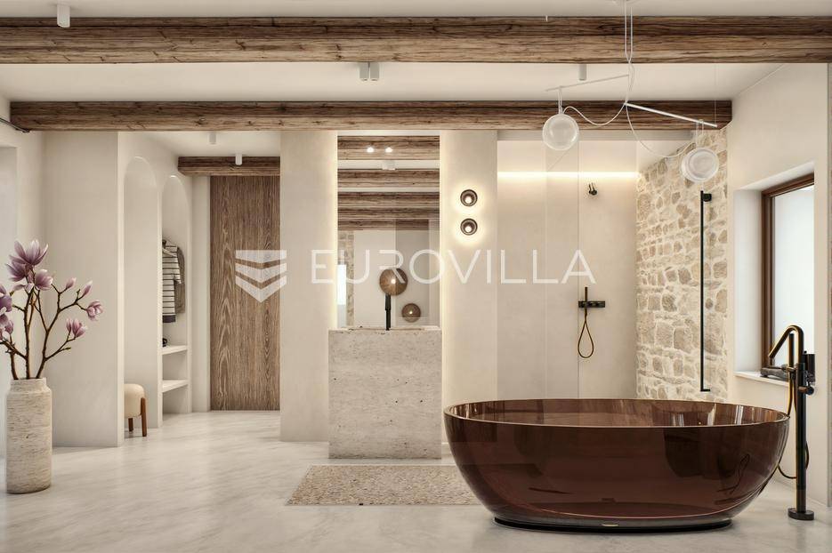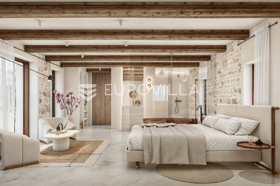 Ova vila s 4 spavaće sobe prostire se na impresivnih 400 četvornih metara stambenog prostora ispod raskošnih stropova visokih 3 metra, koji pojačavaju njezin osjećaj prostranosti. Klasična mediteranska arhitektura sa svojim očaravajućim kamenim zidovima utjelovljuje bezvremensku eleganciju, pozivajući vas u svijet profinjenosti.