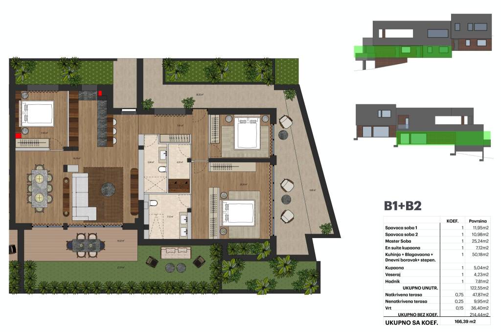 Maksimir, Barutanski jarak, NOVOGRADNJA, vrhunska lokacija okružena zelenilom i prirodom, a opet u neposrednoj blizini centra grada i parka Maksimir. Projekt luksuzne zgrade građene prema najvišim standardima s ukupno 4 stana. Useljenje ljeto 2026. godine.Stan B1+B2 - četverosoban stan u prizemlju zatvorene površine 122,55 m2, , natkrivena terasa 47,84 m2, nenatkrivena terasa 9,95 m2, vrt 36,40 m2. Stan se sastoji od ulaznog prostora, dnevnog boravka, blagovaonice i kuhinje otvorenog tlocrta s izlazom na terasu i vrt, master sobe s garderobom i kupaonicom, dvije spavaće sobe kupaonice i vešeraja. Ukupno obračunski NKP 166,39 m2.Zgradu i stanove odlikuje najviši stupanj opreme i suvremena tehnologije u pogledu instalacija i upravljanja istima, dok energetska učinkovitost zadovoljava najviše standarde.Vrhunska keramika - Vives Ceramica (zid), Iris Ceramica 120 x 60 cm (pod), Mirage 80 x 80 cm (pod outdoor).Ulazna vrata- Aluminijska protuprovalna vrata Antracit s obje strane + Rukohvat 1800 mm (HLM). Sobna vrata- Filomuro vrata po mjeri RAL 9016. Vanjska stolarija - PVC + Aluminij s roletama na električno upravljanje (troslojno staklo).Sanitarije više klase - miješalica wc zidna podžbukna Zuchetti Pan Brushed Nickel, tuš zidni podžbukni set s kišnim tušem 250fi Zucchetti Pan Brushed Nickel, wc školjka globo ceramica (no rim , sporo spuštajuća daska , konzolna), tipkalo soft touch TECE, vodokotlić ugradbeni TECE profil.Parket Galeković četkani hrast 600 x 1800 x 15 mm višeslojni. Grijanje - podno plinsko. Hlađenje - Klima jedinice Mitsubishi (spavaća soba, dnevni boravak). Ulaz - kamera na prepoznavanje tablica i električno upravljanje vratima.Obavezna kupnja garažnog i vanjskog parkirnog mjesta.Prekrasna lokacija s puno privatnosti idealna za uživanje, mirno i kvalitetno življenje. Dobra prometna povezanost, blizina svih potrebnih sadržaja.Za sve ostale informacije stojimo na raspolaganju.