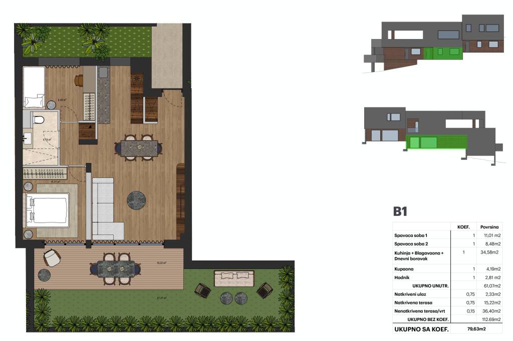 Maksimir, Barutanski jarak, NOVOGRADNJA, vrhunska lokacija okružena zelenilom i prirodom, a opet u neposrednoj blizini centra grada i parka Maksimir. Projekt luksuzne zgrade građene prema najvišim standardima s ukupno 4 stana. Useljenje ljeto 2026. godine.Stan B1 - trosoban stan u prizemlju zatvorene površine 61,07 m2, natkriveni ulaz 2,33 m2, natkrivena terasa 15,22 m2, vrt 36,40 m2. Stan se sastoji od ulaznog prostora, dnevnog boravka, blagovaonice i kuhinje otvorenog tlocrta s izlazom na terasu i vrt, dvije spavaće sobe i kupaonice. Ukupno obračunski NKP 79,63 m2.Zgradu i stanove odlikuje najviši stupanj opreme i suvremena tehnologije u pogledu instalacija i upravljanja istima, dok energetska učinkovitost zadovoljava najviše standarde.Vrhunska keramika - Vives Ceramica (zid), Iris Ceramica 120 x 60 cm (pod), Mirage 80 x 80 cm (pod outdoor).Ulazna vrata- Aluminijska protuprovalna vrata Antracit s obje strane + Rukohvat 1800 mm (HLM). Sobna vrata- Filomuro vrata po mjeri RAL 9016. Vanjska stolarija - PVC + Aluminij s roletama na električno upravljanje (troslojno staklo).Sanitarije više klase - miješalica wc zidna podžbukna Zuchetti Pan Brushed Nickel, tuš zidni podžbukni set s kišnim tušem 250fi Zucchetti Pan Brushed Nickel, wc školjka globo ceramica (no rim , sporo spuštajuća daska , konzolna), tipkalo soft touch TECE, vodokotlić ugradbeni TECE profil.Parket Galeković četkani hrast 600 x 1800 x 15 mm višeslojni. Grijanje - podno plinsko. Hlađenje - Klima jedinice Mitsubishi (spavaća soba, dnevni boravak). Ulaz - kamera na prepoznavanje tablica i električno upravljanje vratima.Obavezna kupnja garažnog i vanjskog parkirnog mjesta.Prekrasna lokacija s puno privatnosti idealna za uživanje, mirno i kvalitetno življenje. Dobra prometna povezanost, blizina svih potrebnih sadržaja.Za sve ostale informacije stojimo na raspolaganju.