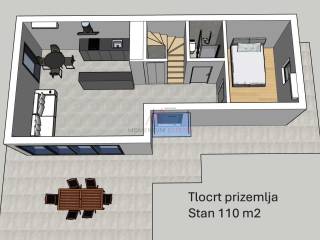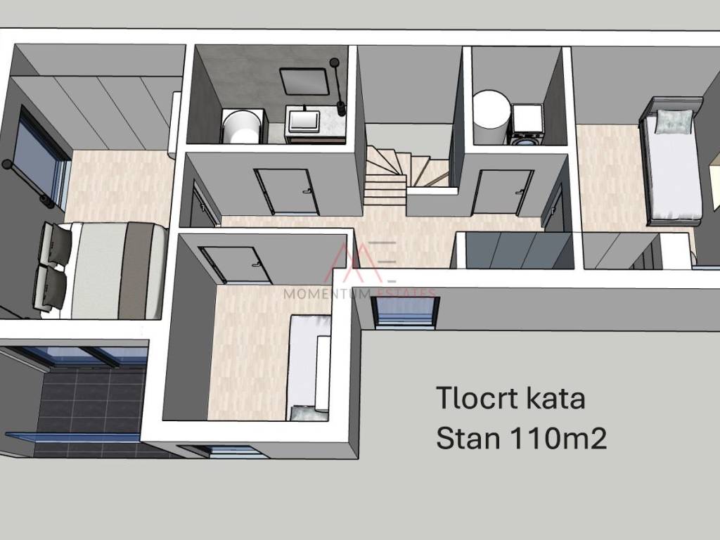 Stan se sastoji se od prostranog dnevnog boravka, jugo istočne orijentacije na koji se nastavlja potpuno i moderno opremljena prostrana kuhinja i blagovaona. Uz dnevni boravak i kuhinju u prizemlju stana nalazi se i spavaća soba, te kupaonica s tušem. Na katu su smještene tri spavaće sobe, od kojih jedna ima i izlaz na loggiu, velika kupaona sa kadom, te vešeraj Unutrašnjost je opremljena u skandinavskom prozračnom stilu, sa visokokvalitetnim i prilagođenim namještajem koji osigurava visoku funkcionalnost, ali i podiže estetsku vrijednost kuće.