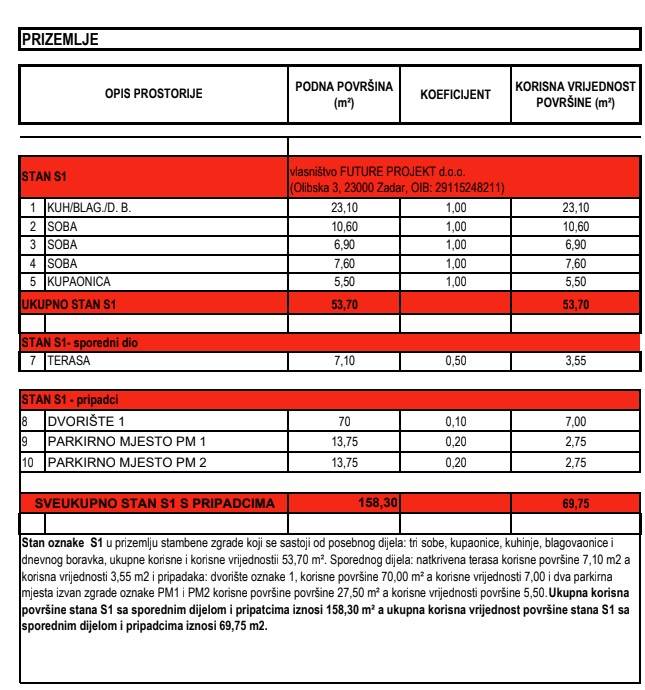 Plovanija, novogradnja, objekt sa ukupno 8 stambenih jedinica; prizemlje sa dva stana, 1. i 2. kat s tri stambene jedinice, po jedan jednosoban stan i dva manja trosobna stana. Na prodaju je stan u prizemlju oznake S1, koji se sastoji od tri spavaće sobe, kuhinje, blagavaone, dnevnog boravka, kupaone i terase, ukupno 57,25 m2. Pripada mu vrt od 70 m2, prema koef. 0,1 ulazi u kvadraturu etažne jedinice sa 7 m2 i dva parkirna mjesta svako 13,75 m2, prema koef 0,20 2,75 m2 . Etažna jedinica stana S1 će imati ukupno 69,75 m2. Klima, podno grijanje u svim prostorijama. Zgrada će biti upisana na firmu te kupac ne plaća porez na promet nekretnina. Planirano useljenje je do ljeta 2026. godine. Ispred zgrade će prema prostornom planu biti veliki javni park površine 5000 m2 sa igralištem koji je upisan u građevinsku dozvolu.