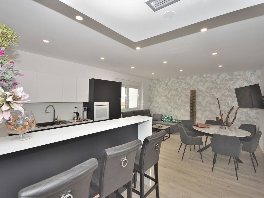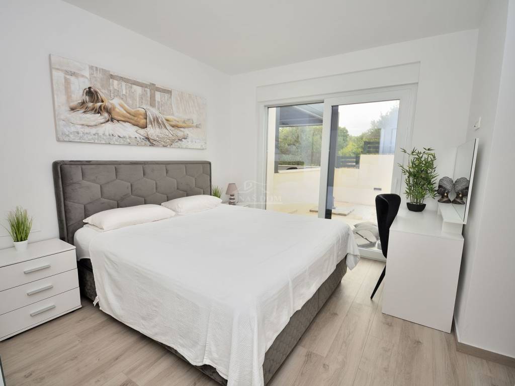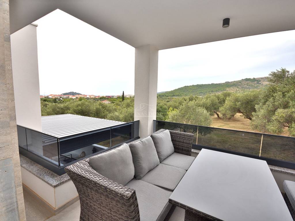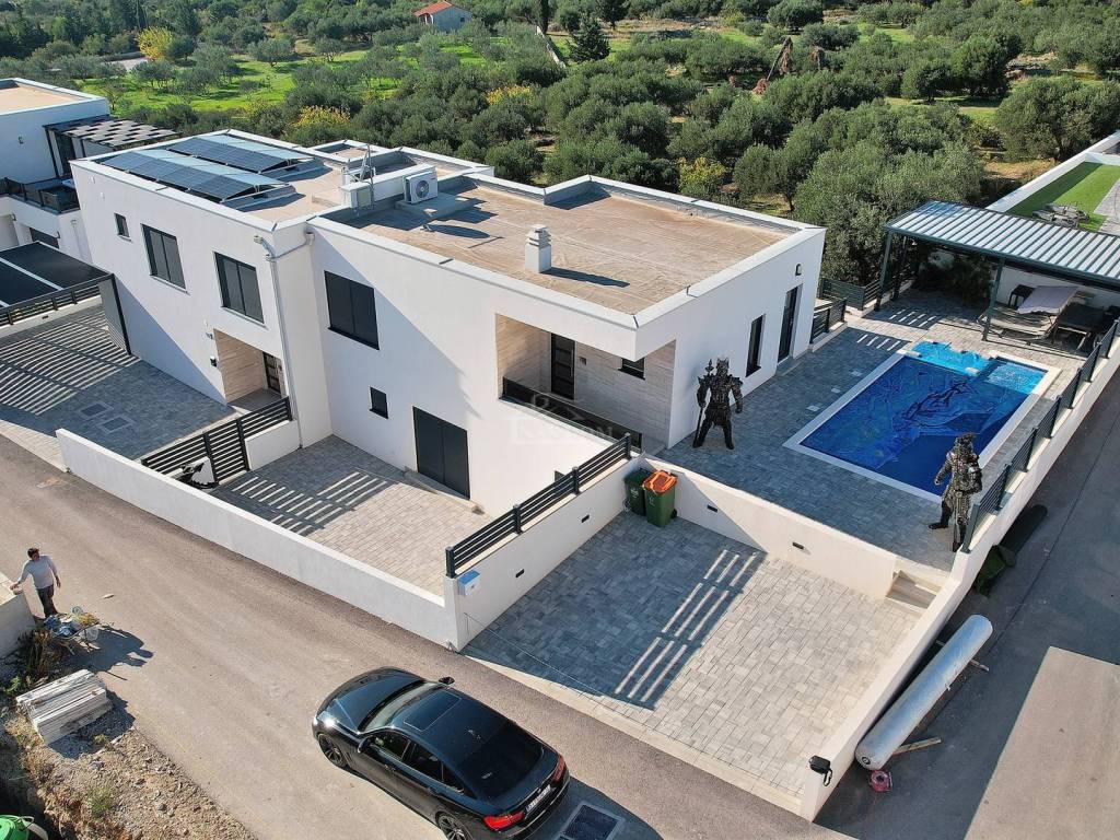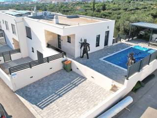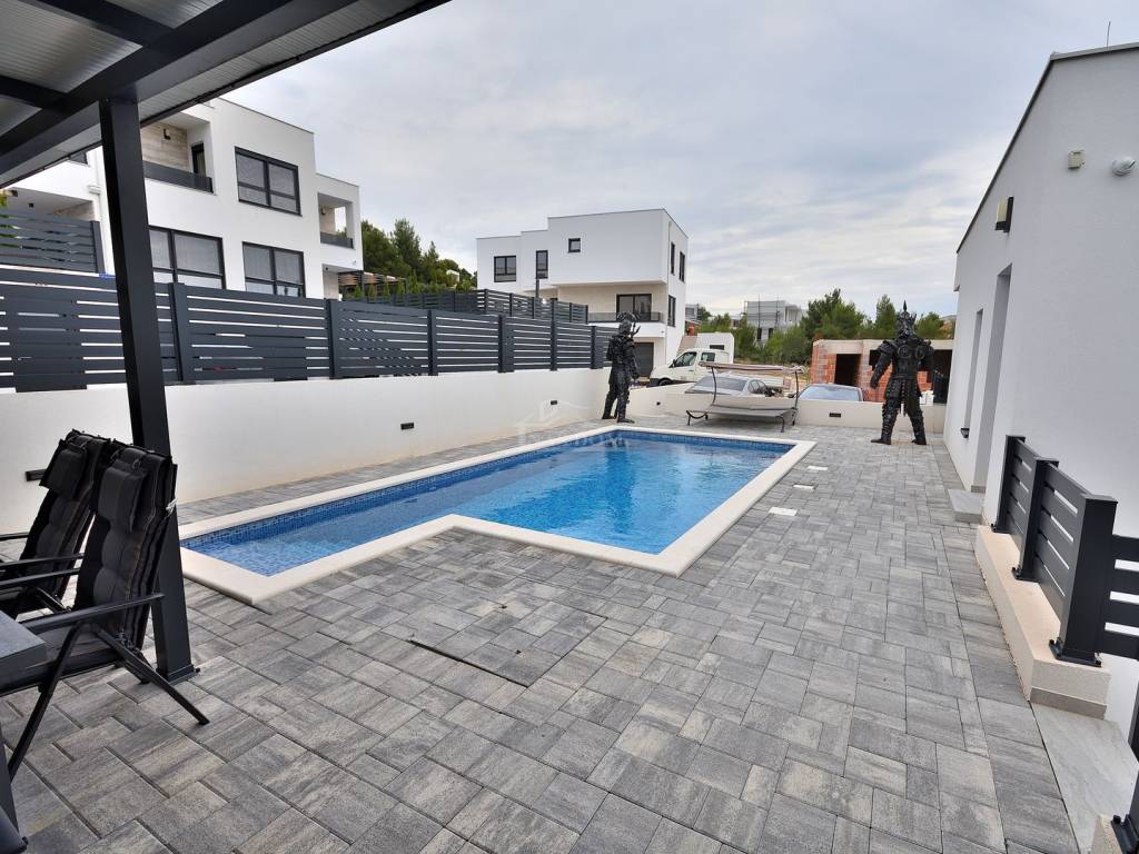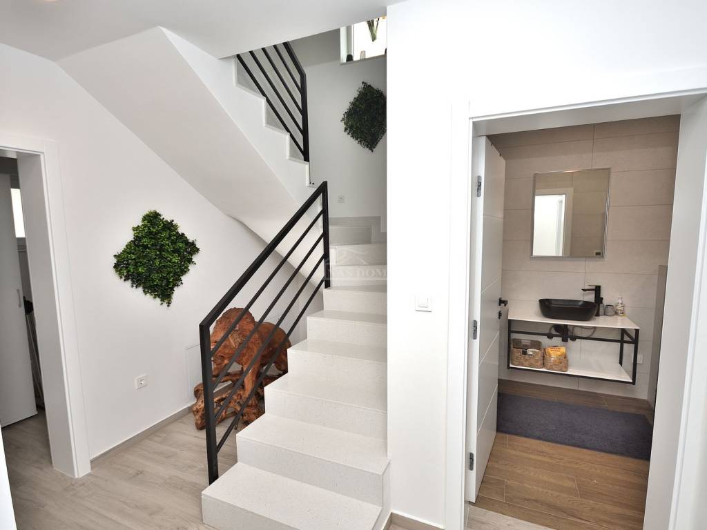 Vodice - in una posizione tranquilla, alla fine di una strada senza uscita nella zona più recente di Vodice, si trova questa splendida doppia villetta con piscina. La casa, con una superficie utile abitabile di 159,80 m2, è composta da due piani: PIANO TERRA + PRIMO PIANO. Il piano superiore della casa è costituito da ingresso coperto, corridoio, bagno, ripostiglio, cucina con sala da pranzo e soggiorno, oltre a una terrazza coperta di 13,19 m2 con vista sul mare. Una scala interna conduce al piano terra della casa dove si trovano lavanderia + ripostiglio, corridoio, bagno, due camere da letto e la camera matrimoniale con bagno privato. Ogni stanza ha la propria terrazza e accesso al giardino. La casa è stata costruita nel 2024 secondo gli ultimi standard edilizi, è climatizzata e arredata con mobili moderni e varie installazioni artistiche e sculture, pronta per essere abitata.