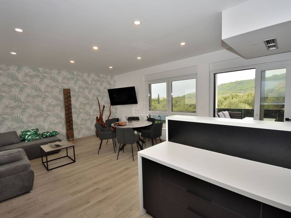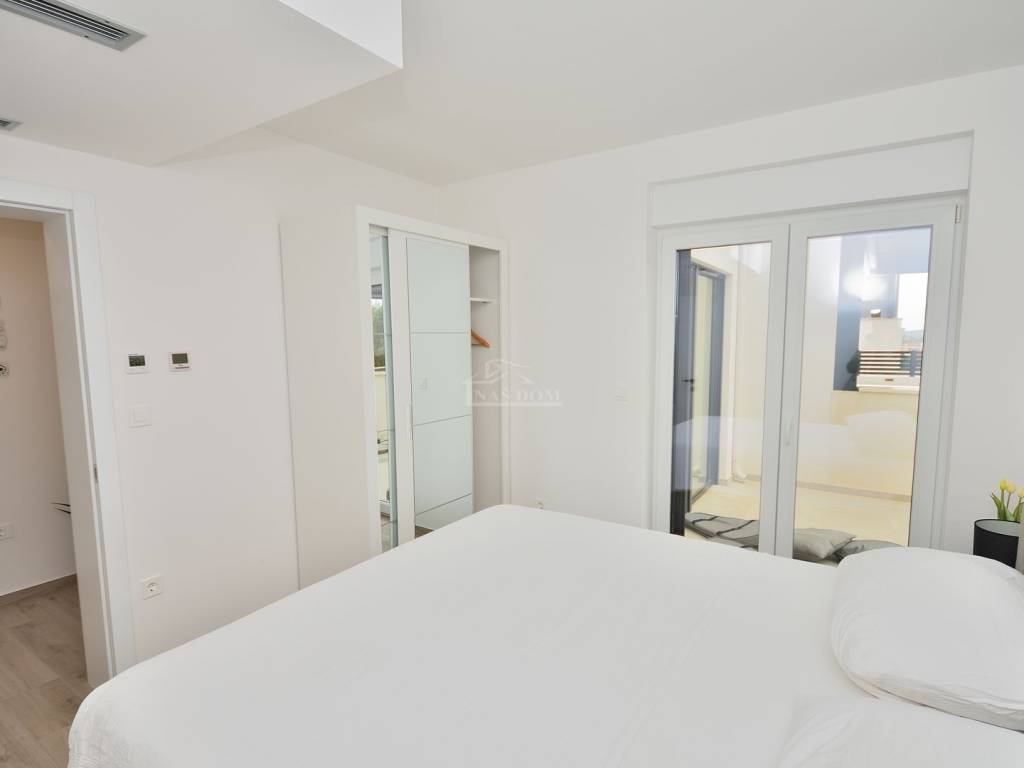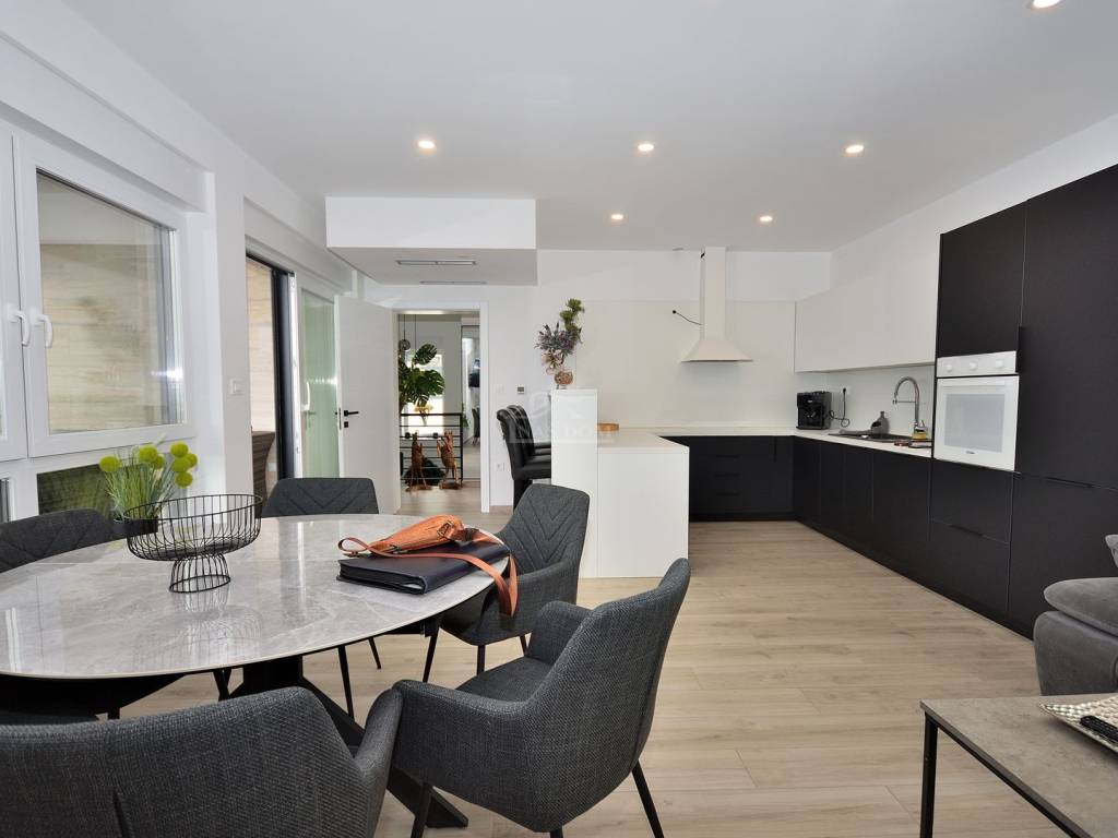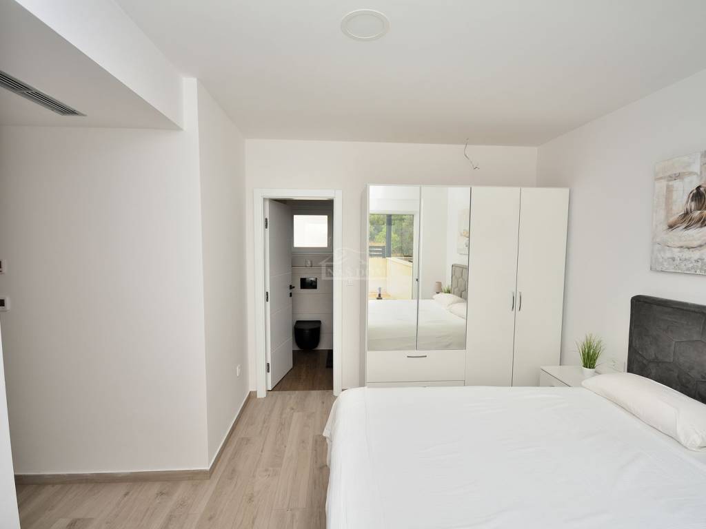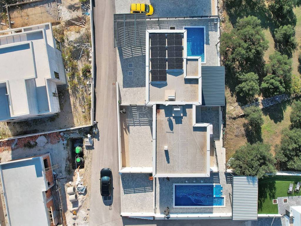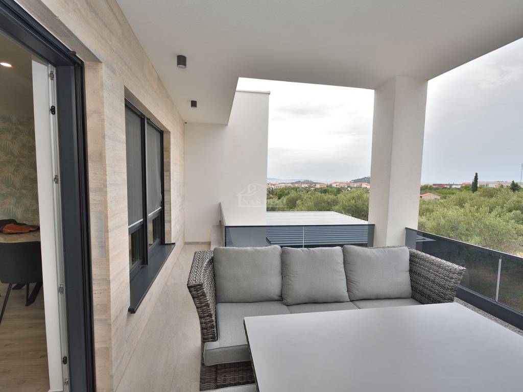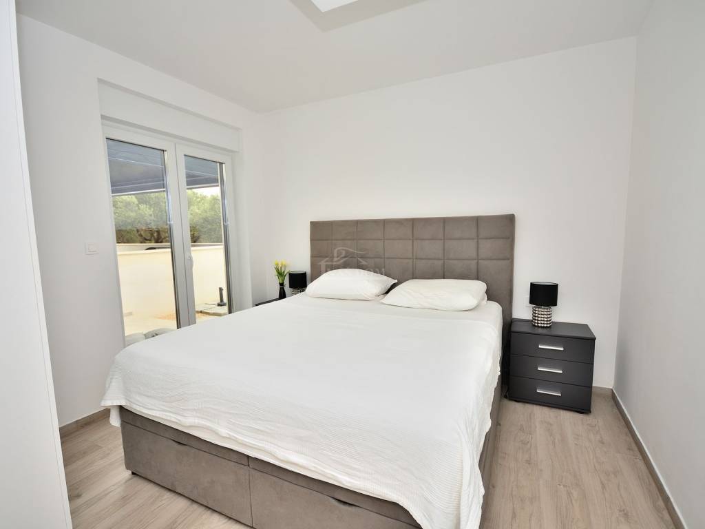 Vodice - in una posizione tranquilla, alla fine di una strada senza uscita nella zona più recente di Vodice, si trova questa splendida doppia villetta con piscina. La casa, con una superficie utile abitabile di 159,80 m2, è composta da due piani: PIANO TERRA + PRIMO PIANO. Il piano superiore della casa è costituito da ingresso coperto, corridoio, bagno, ripostiglio, cucina con sala da pranzo e soggiorno, oltre a una terrazza coperta di 13,19 m2 con vista sul mare. Una scala interna conduce al piano terra della casa dove si trovano lavanderia + ripostiglio, corridoio, bagno, due camere da letto e la camera matrimoniale con bagno privato. Ogni stanza ha la propria terrazza e accesso al giardino. La casa è stata costruita nel 2024 secondo gli ultimi standard edilizi, è climatizzata e arredata con mobili moderni e varie installazioni artistiche e sculture, pronta per essere abitata.