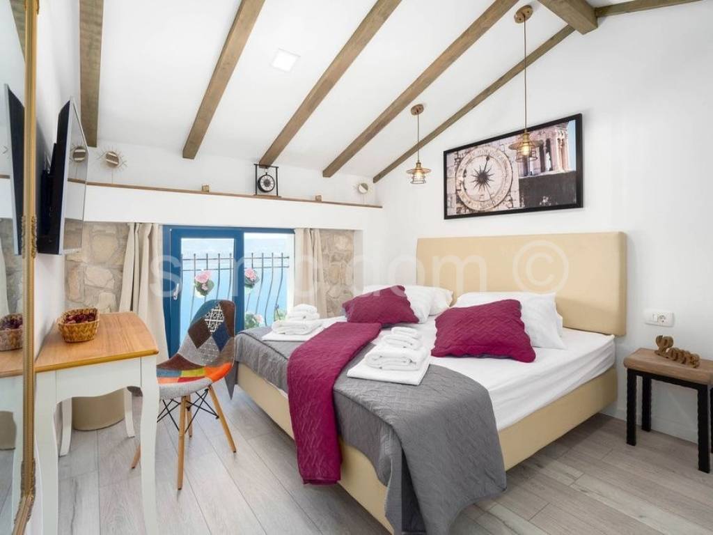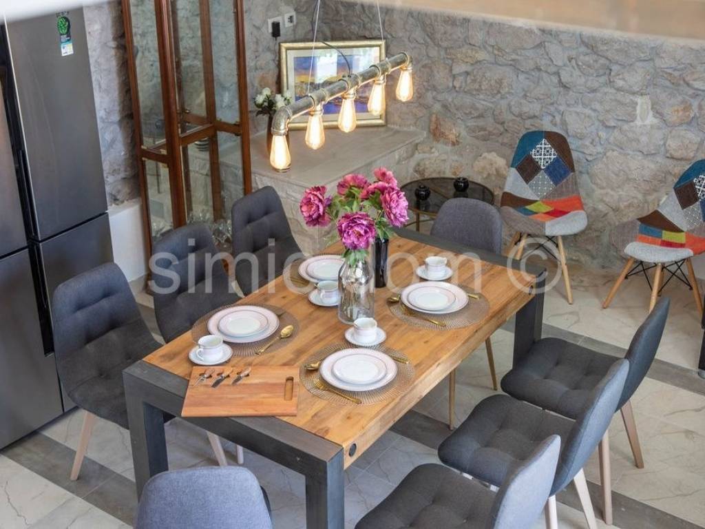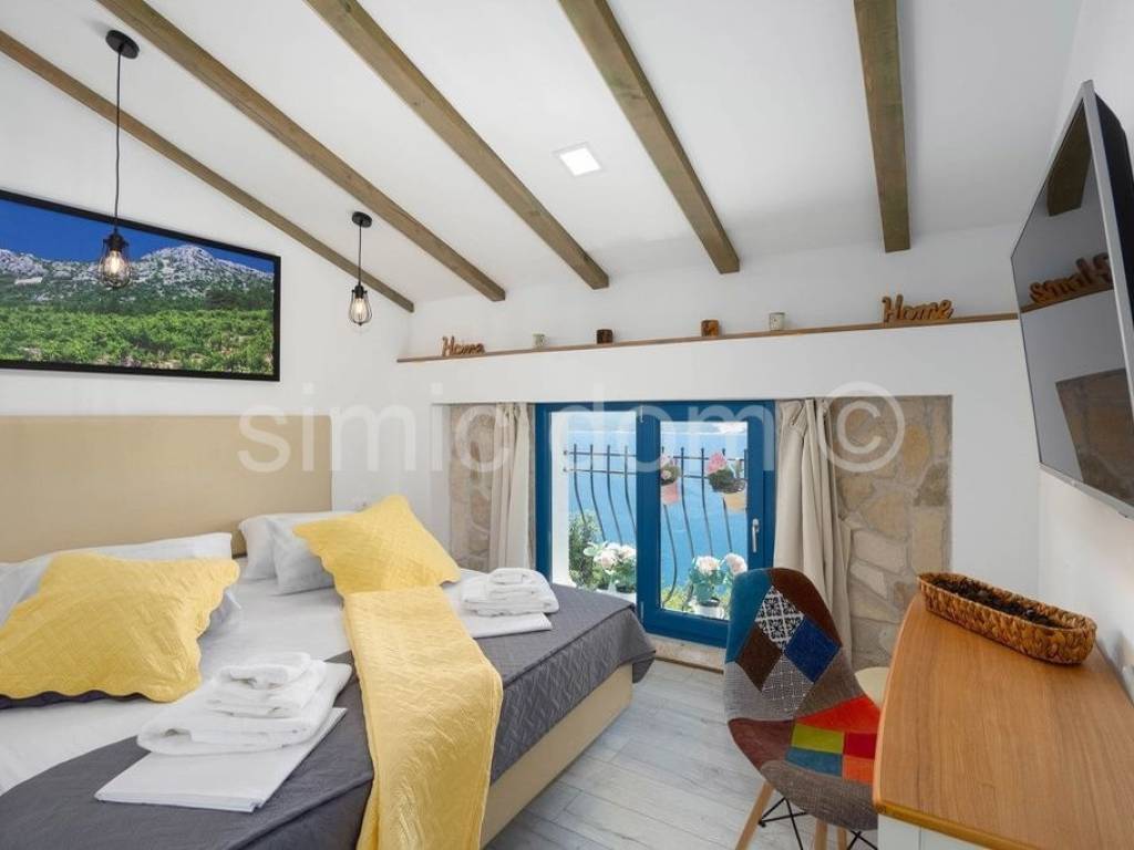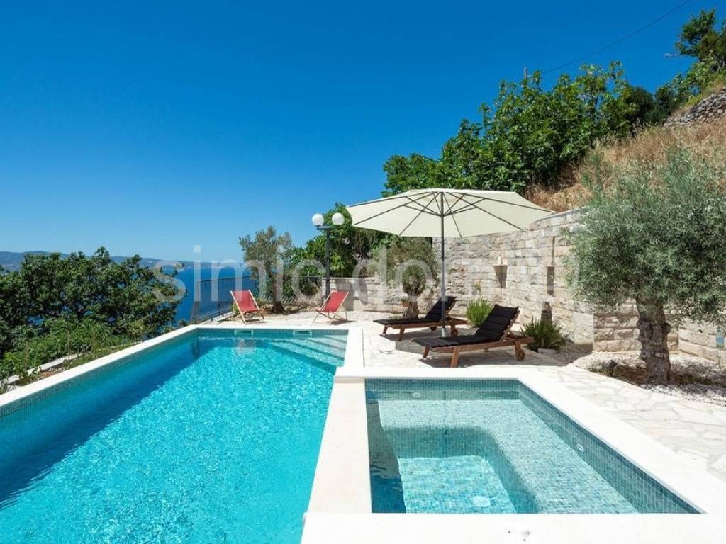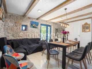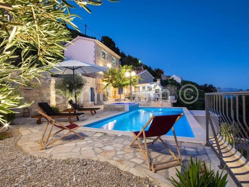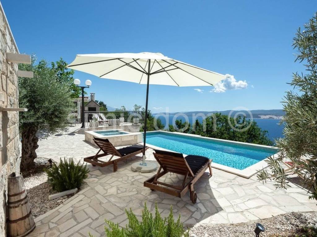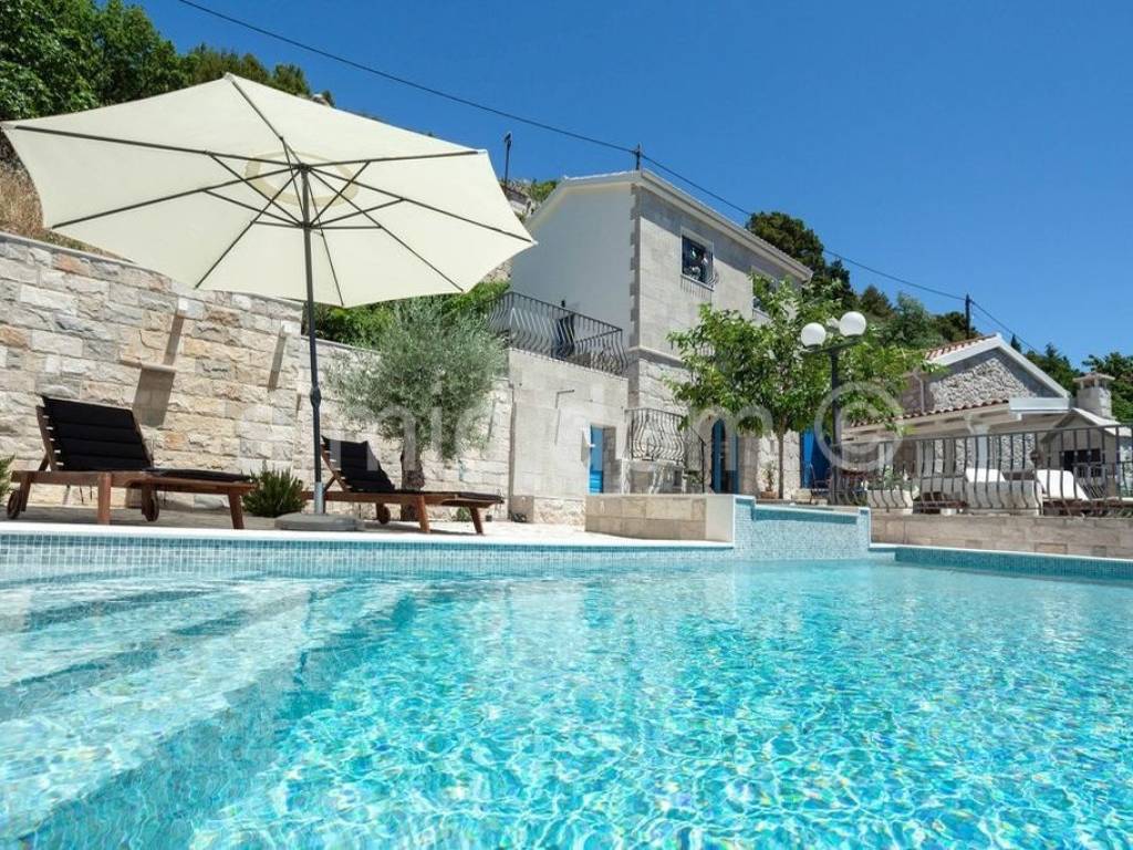 We are mediating the sale of a beautiful stone house with a truly impressive view of Omis, Brac and the entire surrounding area. It is a house that was built on ancient foundations and was brought to its current state in 2020, which is an impressive combination of tradition and modern, functional details. The living area is 120m2 and consists of four bedrooms and three bathrooms on the first floor, and on the ground floor there is a very charming living room with a kitchen. The living area leads out onto a spacious tiled terrace with a swimming pool, a social area made of high-quality stone, a barbecue... The house has everything you need for a pleasant stay (it is sold equipped and furnished with the most proven choices), and the peace of the location with the availability of all amenities in Omis, 3 km away, guarantees the exceptional potential of the property. Ownership is in order.