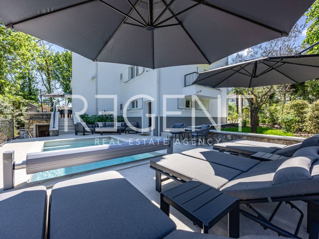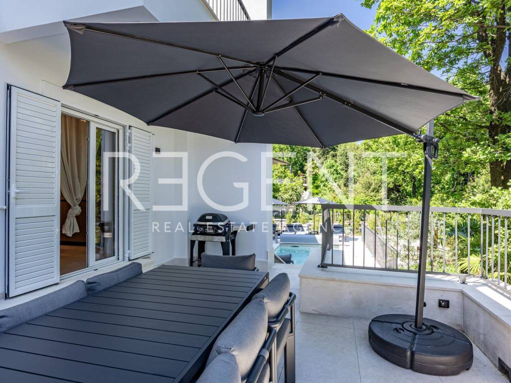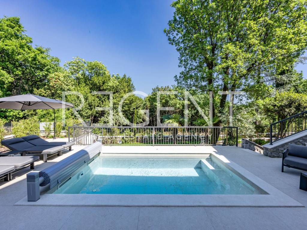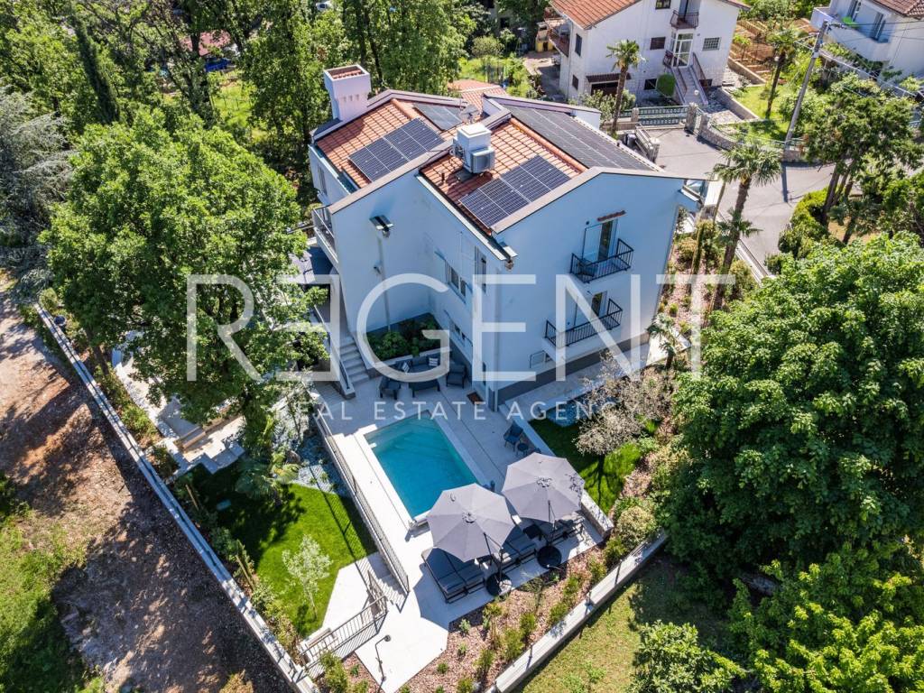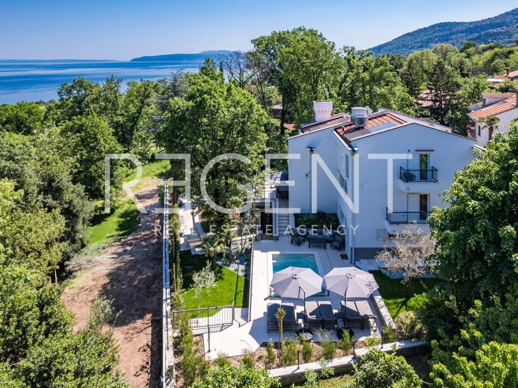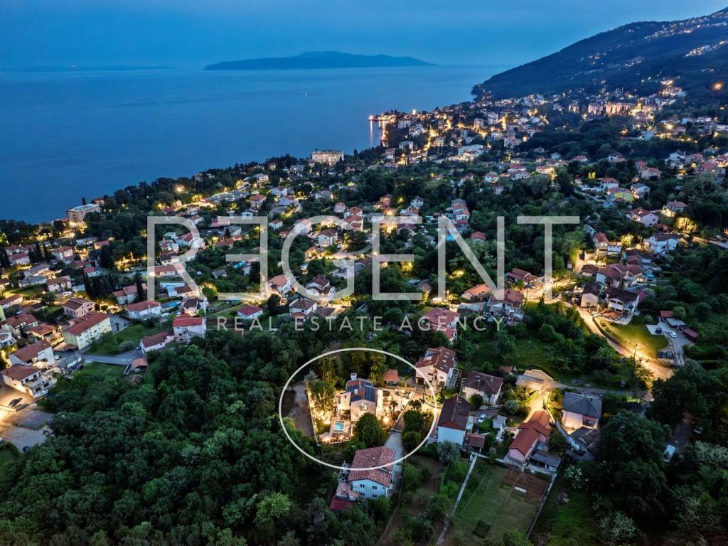 In una splendida posizione ad Abbazia si trova una villa di lusso con una superficie abitabile totale di 313 m2. La villa si estende su 3 piani. Si compone di: corridoio, soggiorno open space con cucina e sala da pranzo, cinque camere da letto, sei bagni, terrazzo, giardino e zona spa. La casa ha una piscina esterna. Tre posti auto esterni e un garage. Contiene videosorveglianza, sistema di allarme, camino, sistema di casa intelligente. La casa è stata ristrutturata, è orientata a sud. Posizione: a 300 m dal mare, in una strada tranquilla, vicino alla strada principale, ai mezzi pubblici, al negozio.