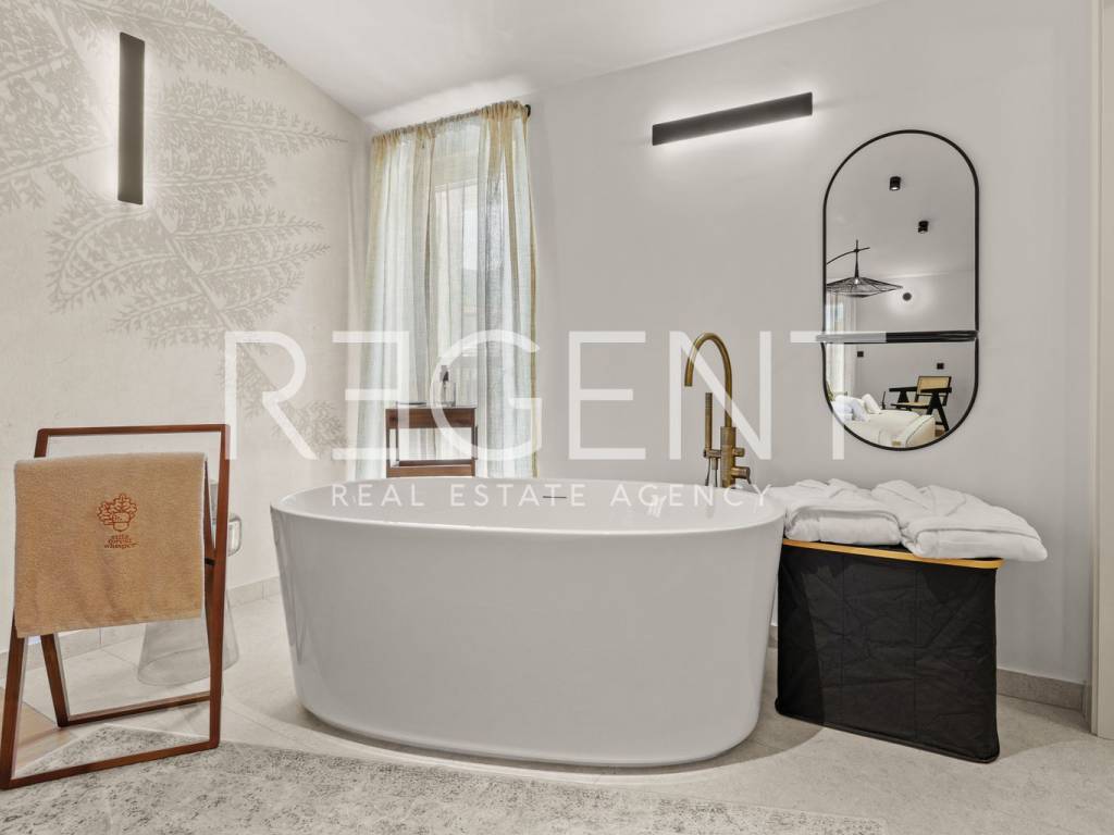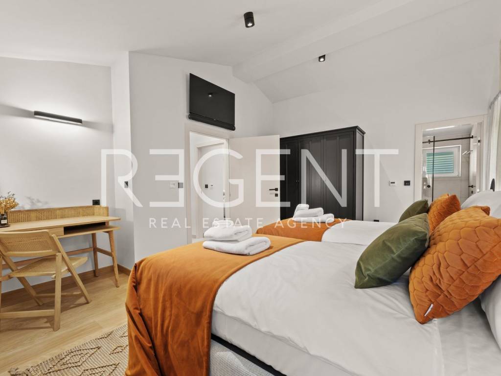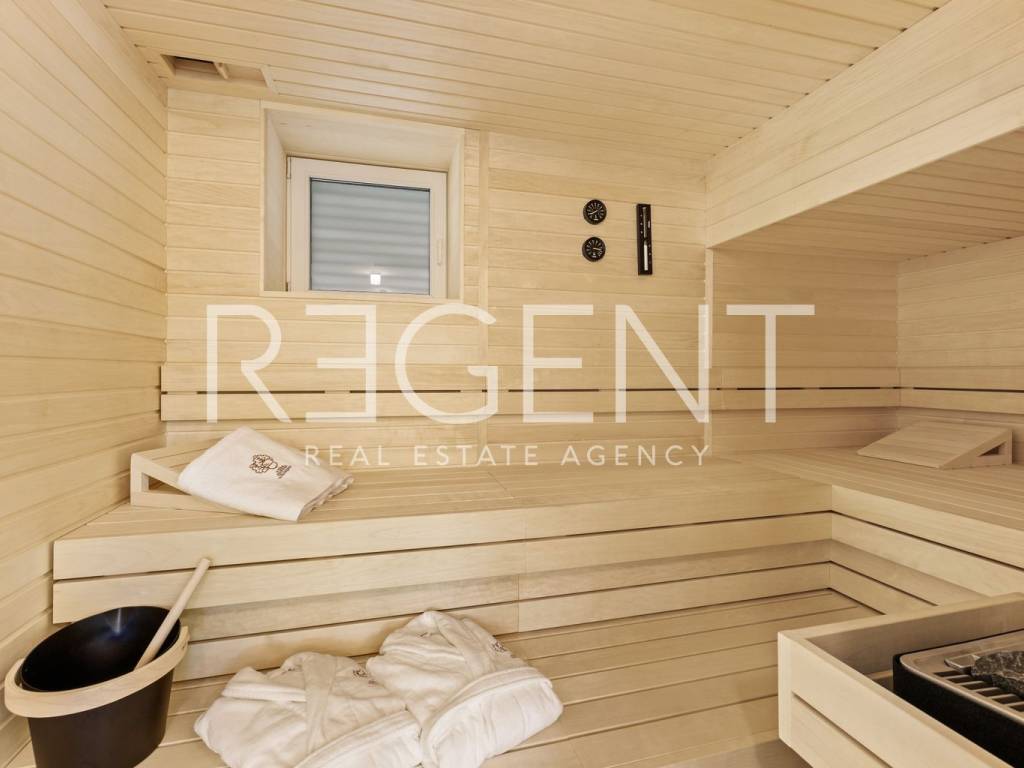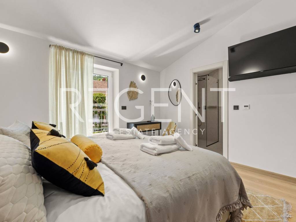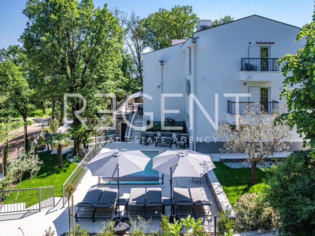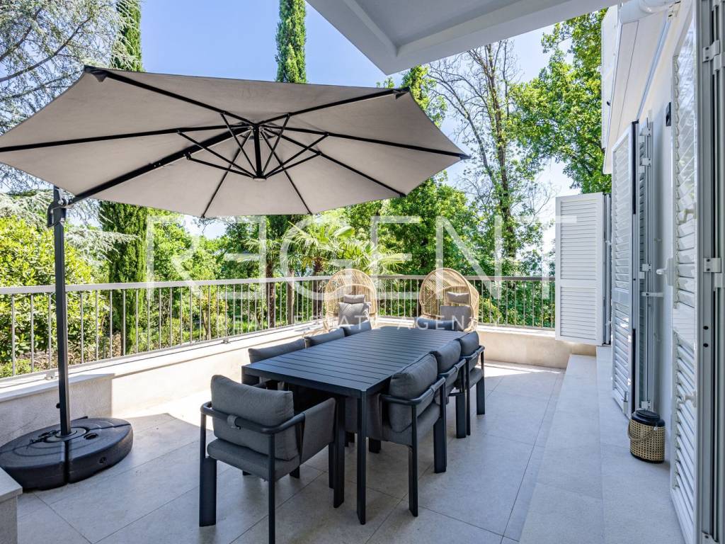 In una splendida posizione ad Abbazia si trova una villa di lusso con una superficie abitabile totale di 313 m2. La villa si estende su 3 piani. Si compone di: corridoio, soggiorno open space con cucina e sala da pranzo, cinque camere da letto, sei bagni, terrazzo, giardino e zona spa. La casa ha una piscina esterna. Tre posti auto esterni e un garage. Contiene videosorveglianza, sistema di allarme, camino, sistema di casa intelligente. La casa è stata ristrutturata, è orientata a sud. Posizione: a 300 m dal mare, in una strada tranquilla, vicino alla strada principale, ai mezzi pubblici, al negozio.