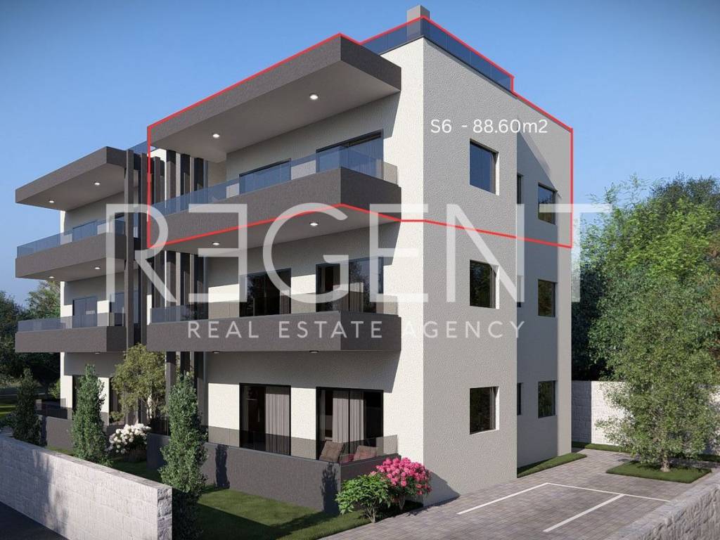 Appartamento con tre camere da letto di 88,60 m², situato al secondo piano di un moderno edificio residenziale a Sukošan, vicino a Zara. L'appartamento si trova in una posizione tranquilla, a pochi minuti a piedi dal mare e da tutti i servizi importanti. Composto da un corridoio, due camere da letto, un bagno, una cucina e un soggiorno con accesso alla terrazza. L'appartamento comprende anche una scala privata che conduce a una terrazza sul tetto separata con una superficie totale di 68,81 m² e un posto auto esterno. L'appartamento sarà dotato di materiali e attrezzature di alta qualità: • Struttura in cemento armato, muri in mattoni • Infissi in legno-alluminio di alta qualità • Piastrelle in gres porcellanato italiano di 1a classe (Marazzi/Mirage) • Parquet in rovere nelle camere da letto • Riscaldamento a pavimento in bagno e soggiorno • Sistema di climatizzazione multi-split Mitsubishi • Pietra nelle scale e all'ingresso dell'edificio • Sanitari Villeroy & Boch • Posto auto pavimentato con cubetti di cemento • Giardini paesaggistici e ambiente progettato orticolturalmente • Porta d'ingresso antintrusione L'edificio è attualmente in costruzione e il completamento dei lavori è previsto per gennaio 2026. Questa proprietà è un'eccellente opportunità per la vita familiare, ma anche come investimento per l'affitto turistico. Per maggiori informazioni o per concordare una visita, non esitate a contattarci.