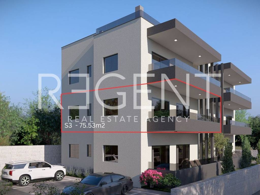 Appartamento con tre camere da letto di 75,53 m², situato al primo piano di un moderno edificio residenziale a Sukošan, vicino a Zara. L'appartamento si trova in una posizione tranquilla, a pochi minuti a piedi dal mare e da tutti i servizi importanti. L'appartamento è composto da ingresso, due camere da letto, bagno, cucina e soggiorno con accesso al terrazzo. Inoltre, l'appartamento dispone di un posto auto esterno. L'appartamento sarà dotato di materiali e attrezzature di alta qualità: • Struttura in cemento armato, muri in mattoni • Serramenti in legno-alluminio di alta qualità • Piastrelle in gres porcellanato italiano di 1a classe (Marazzi/Mirage) • Parquet in rovere nelle camere da letto • Riscaldamento a pavimento in bagno e soggiorno • Sistema di climatizzazione multi-split Mitsubishi • Pietra nelle scale e all'ingresso dell'edificio • Sanitari Villeroy & Boch • Parcheggio pavimentato con blocchi di cemento • Giardini paesaggistici e ambiente progettato orticolturalmente • Porta d'ingresso antintrusione L'edificio è attualmente in costruzione e il completamento dei lavori è previsto per gennaio 2026. Questa proprietà è un'eccellente opportunità per la vita familiare, ma anche come investimento per l'affitto turistico. Per maggiori informazioni o per fissare un appuntamento per una visita, non esitate a contattarci.