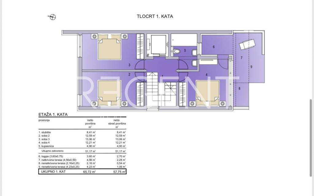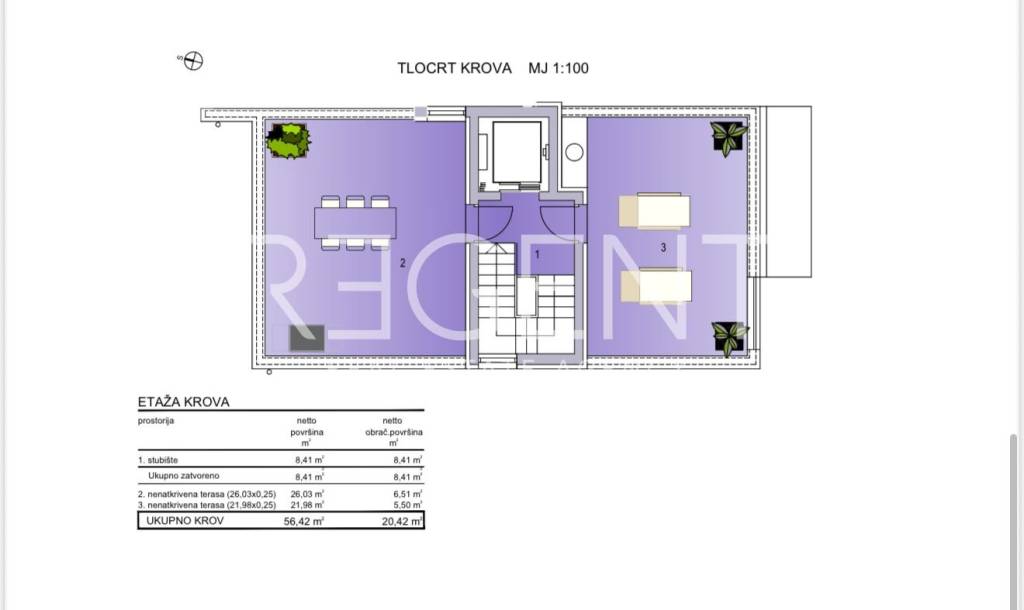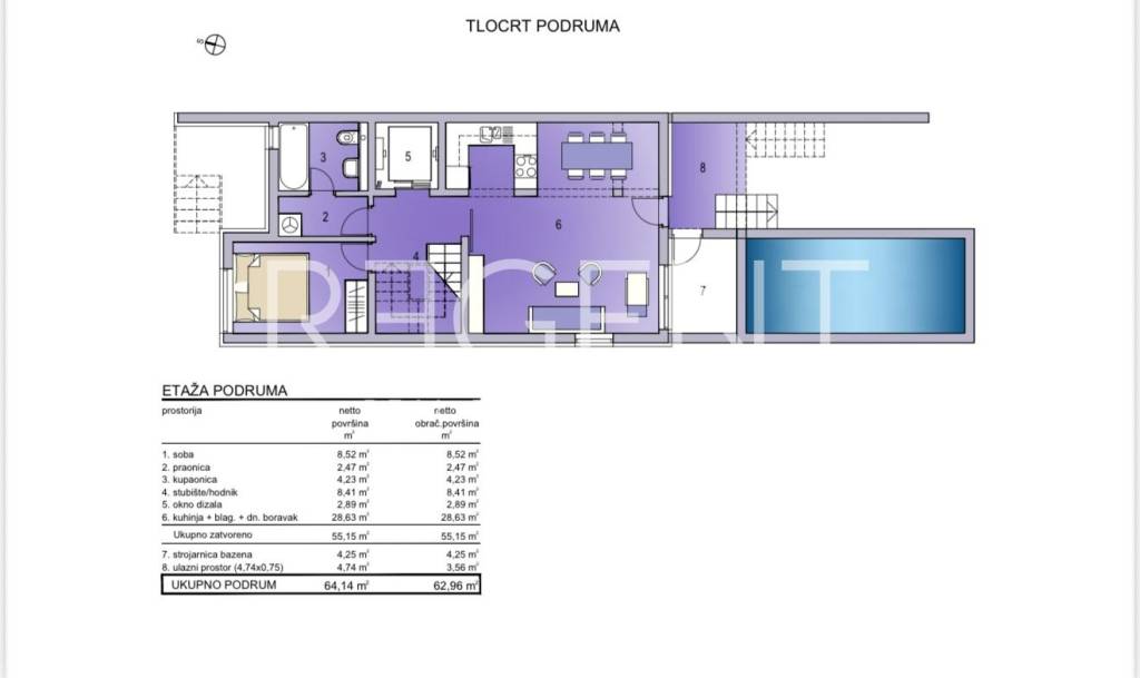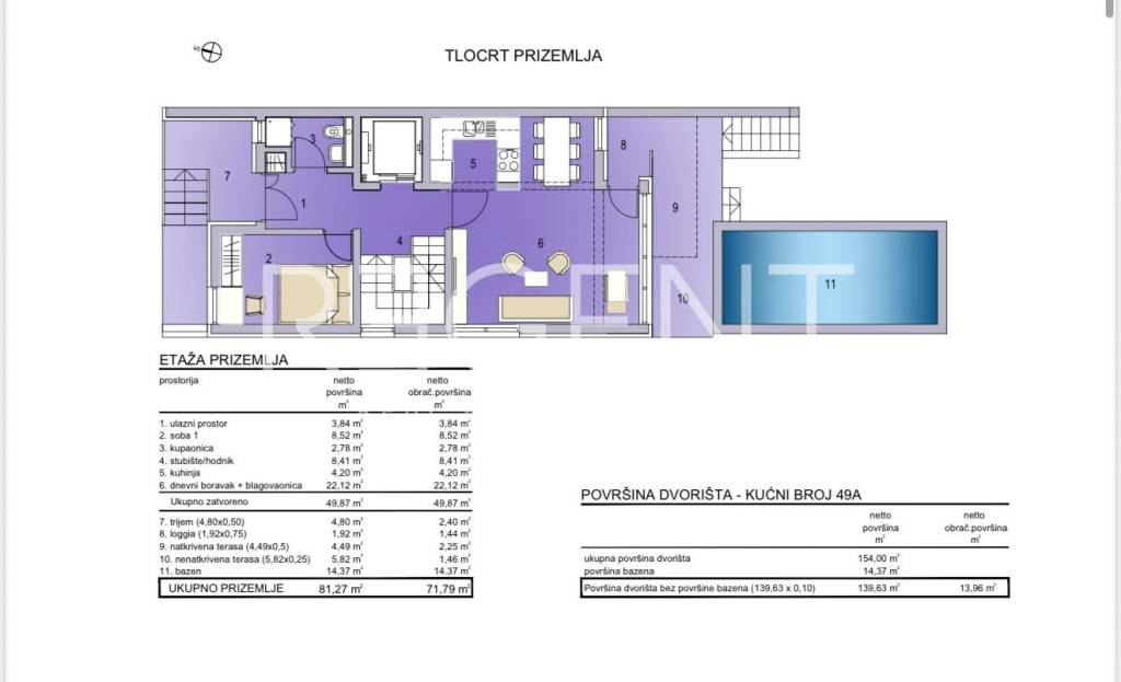 In vendita è una villa a schiera a Kaštel Štafilić, a soli 100 m dal mare. La superficie netta totale è di 226 m² (lorda 407 m²), e si compone di seminterrato, piano terra, primo piano e terrazza sul tetto. La villa ha un cortile privato di 154 m² con piscina di 14 m² e un ascensore per 8 persone che collega tutti i piani. All'interno ci sono quattro camere da letto, tre bagni, cucina con sala da pranzo, soggiorno e diverse terrazze e logge. La proprietà è attualmente in costruzione e il completamento è previsto entro 10-12 mesi.