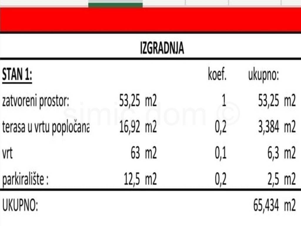 A new apartment located in a smaller building near Trogir, for sale in the Plano area. Apartment S1 is placed on the ground floor and has a total internal area of 53.25 m2 and an additional 16.92 m2 of paved terrace, 63 m2 of garden, and an outdoor parking space included in the price. With all accessories included, the apartment has a total net area of 65.43 m2. It consists of a hallway, two bedrooms, a bathroom, and a kitchen with a dining room and a living room with access to a paved terrace and garden. The apartments will be excellently equipped: underfloor heating will be installed throughout the apartment, external and internal insulation, mosquito nets, electric shutters, an air conditioning system, with the buyer being able to participate in the selection of ceramics and bathroom equipment. The planned completion of the building is spring 2027. The location of the building is excellent, on a quiet street, while the nearest amenities such as shops, cafes and pharmacies are only a 2-minute walk away, and the center of Trogir is about 4.5km away.