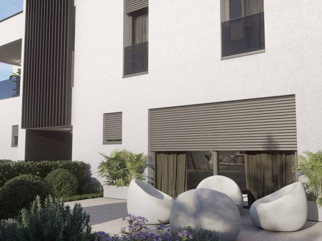 Stan od 102.35 m2, sastoji se od: hodnika, prostranog openspace dnevnog boravka s kuhinjom i blagovaonicom (33.48 m2), koji ima izlazak na vrt veličine 80 m2 i balkon veličine 7.13 m2, dvije prostrane spavaće sobe, od kojih jedna ima izlazak na vrt, kupaonice i dodatnog toaleta, te ostave. Spremište i 2 garažna parkirna mjesta ukupne su kvadrature 39 m2.