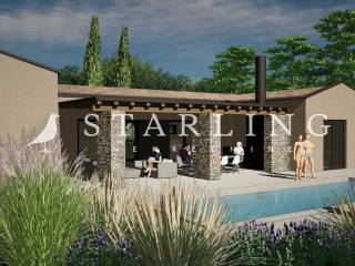 Projekt spaja suvremenu arhitekturu s tradicionalnim elementima koristeći prirodne materijale poput kamena, drva i betona. Velike staklene površine i jednostavne linije osiguravaju puni vizualni kontakt interijera s krajolikom i planiranim bazenom.