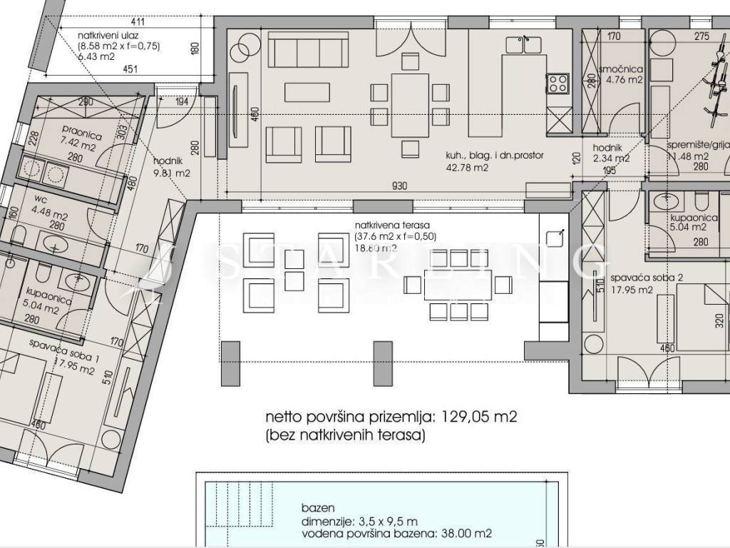 Planirana kuća ima otvorene prostore, obilje prirodnog svjetla i terase koje se nastavljaju na okoliš, čineći objekt idealnim za miran i komforan život.