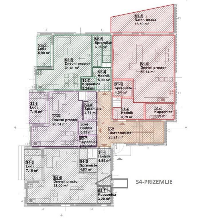 S4-three-bedroom, two-storey apartment on the ground floor and first floor of a residential building with a net area of ​​125.82 m/2. The apartment consists of a ground floor with an entrance hall, a living room with an adjoining kitchen and dining room, a bathroom and a small storage room. The living room opens onto a loggia of 7.16 m/2. Internal stairs lead to the first floor where there are three bedrooms, one of which is a master bedroom with its own bathroom, a shared bathroom and a laundry room. Each room also has its own loggia. The apartment also has a garden on the ground floor with an area of ​​60.88 m/2 and two parking spaces.