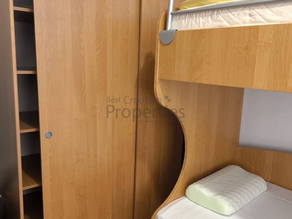 Stan se sastoji od ulaznog hodnika, dnevnog boravka povezanog s kuhinjom i blagovaonicom, spavaće sobe s krevetom na kat te kupaonice s tuš kabinom.