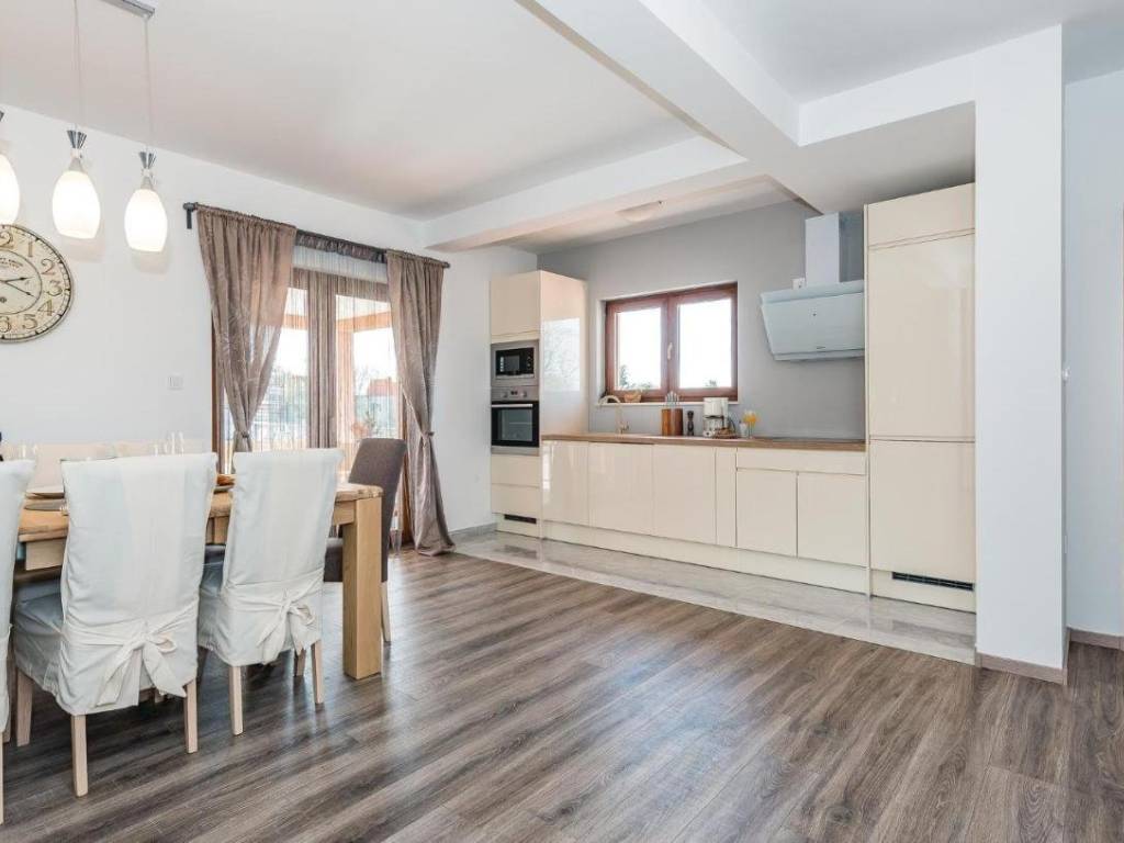 This beautiful and spacious house is spread over two floors. On the ground floor there is a hallway, a large living room with a kitchen and a dining room in one unit, from which there is access to a covered terrace connected to the yard, then one bedroom, a bathroom, a toilet and a laundry room, as well as a storage room. Internal stairs lead to the first floor of the house, which consists of a hallway, three bedrooms with three bathrooms and a covered terrace.