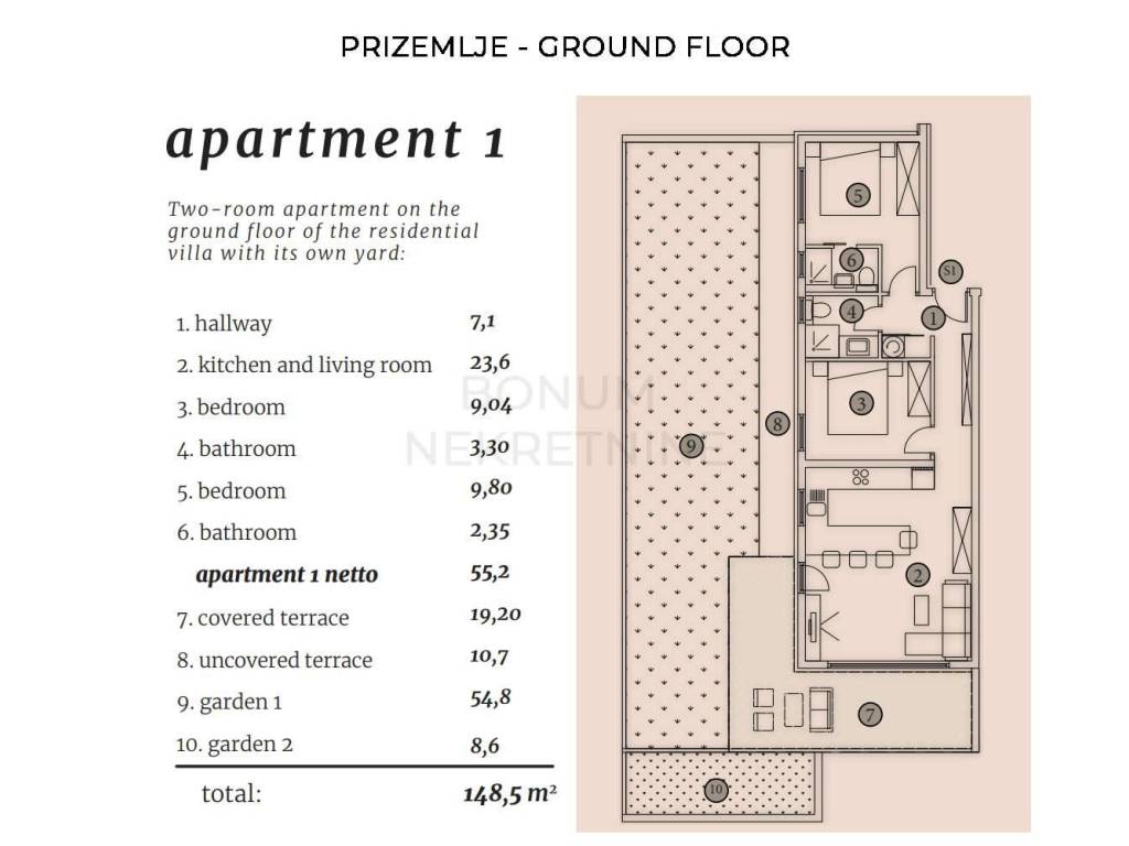 Apartment S1 - The apartment is located on the ground floor of the building. It consists of two bedrooms, two bathrooms, a hallway and a living room with kitchen and dining room in one unit. There is a partially covered terrace and garden in front and on the side. The apartment also has one outdoor parking space. There is a possibility of additional payment for one garage space in the basement of the building (€20,000.00).