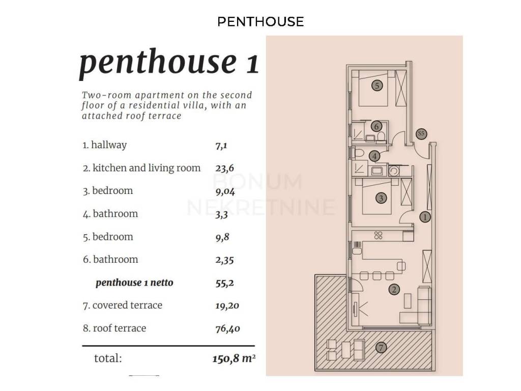 Apartment S6 - The apartment is located on the second floor of the building. It consists of two bedrooms, two bathrooms, a hallway and a living room with kitchen and dining room in one unit and a spacious covered terrace. The special feature of this wonderful apartment is that it also has a roof terrace of 74.20 m2. The apartment also has two garage parking spaces in the basement, and there is an option to pay extra for another garage space.