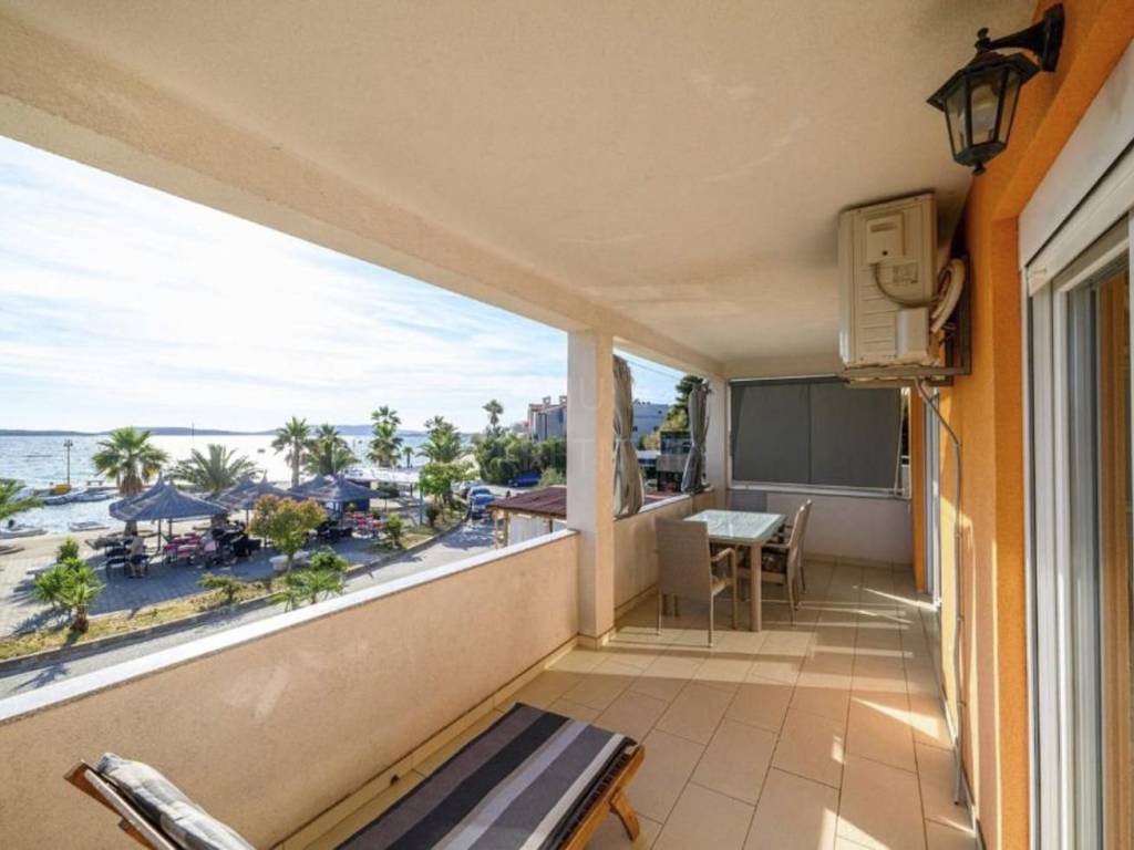 A beautiful house for sale in the first row to the sea, Šibenik-Žaborić. This elegant house, located on a spacious plot, offers an incredible view of the sea. Fully furnished, the house consists of a ground floor and an upper floor, with one apartment on each floor of the same layout.