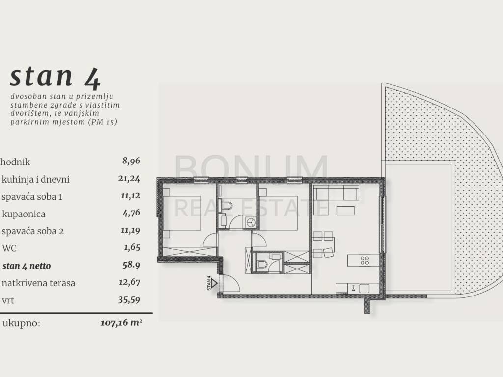 S3- consists of hallway, kitchen, living room and dining room in one unit, two bedrooms, toilet (59.58 m2), covered terrace (58.90 m2), garden of 56.72 m2 and outdoor parking space.