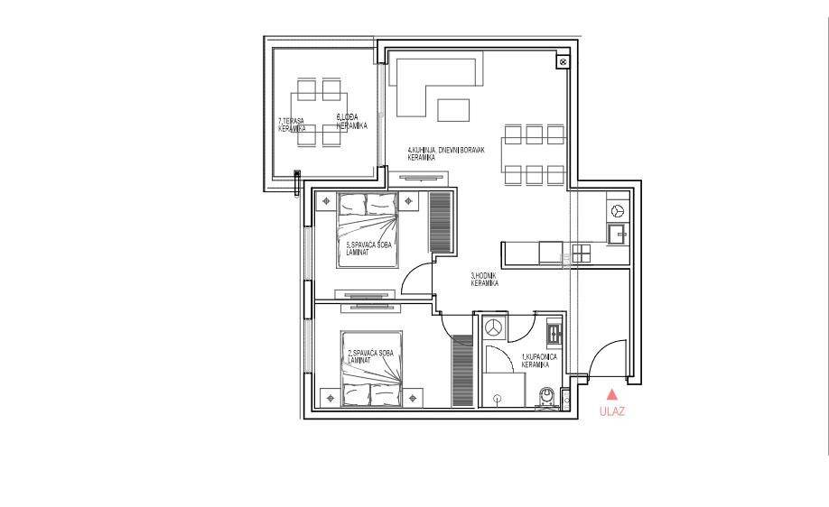 A modern apartment for sale in a new residential building in a prime location in Primošten. Apartment S5 is located on the first floor and covers 67.81 m², and consists of two comfortable bedrooms, an elegant bathroom and a spacious living room with a kitchen. The living room opens onto a terrace of 8.62 m², which offers a sea view. The apartment also comes with an outdoor parking space.