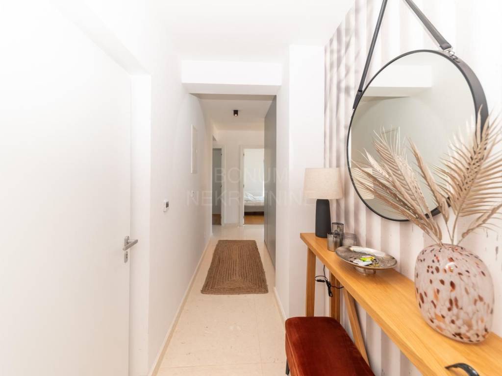 A luxurious apartment for sale in Vodice, residential unit located on the first floor of a small building with a total of three apartments. The apartment has a total floor area of ​​109.83 m² and consists of two hallways, storage room, living room, kitchen with dining room, four bedrooms and two bathrooms. The space is designed to provide maximum comfort and functionality for family life, and at the same time is an excellent investment for tourist rental.