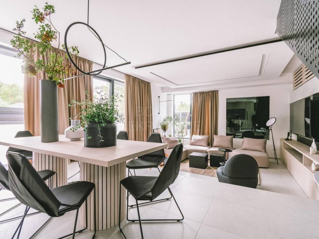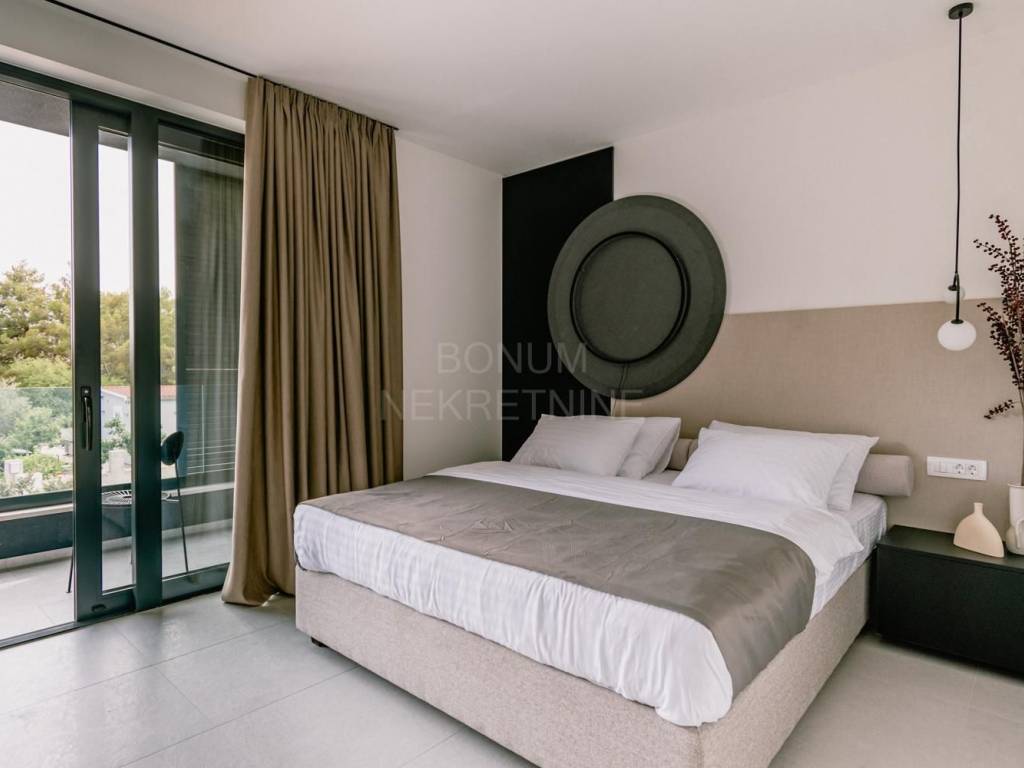 A new truly modern villa for sale with a pool near the sea, Srima-Vodice. It is located in a quiet location. The villa itself consists of a ground floor and an upper floor. On the ground floor there is one bedroom with a bathroom, and a living room with dining room and kitchen in one unit. From the living room there is an exit to the sunbathing area with an outdoor pool and a beautifully landscaped yard. The internal staircase leads to the first floor where there are three more bedrooms, two bathrooms and two covered terraces. The villa itself is sold furnished. The villa was designed by a young architectural studio. Industrial design, many interesting details, high-quality execution, designer pieces of furniture make this real estate a real little miracle in the real estate offer. Also, apart from the proximity to the sea, it is important to emphasize that the property is located at a relatively short distance to the Kaštela and Zadar airports and the highway. It is great whether you want to stay in it all year round or use it as a tourist rental.