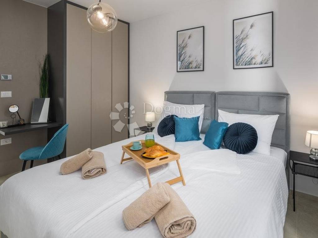 Interijer ove luksuzne vile pomno je dizajniran kako bi pružio maksimalnu udobnost i funkcionalnost. Grijanje je riješeno podnim grijanjem s dizalicom topline, što jamči visoku energetsku učinkovitost i ugodan boravak kroz cijelu godinu. Svaka prostorija opremljena je klima uređajem, osiguravajući savršenu temperaturu unutar kuće bez obzira na sezonu. U prostranom dnevnom boravku smješten je kamin, koji nije samo ukras, već i funkcionalan element koji doprinosi stvaranju tople, ugodne atmosfere, idealne za opuštanje i obiteljska okupljanja.