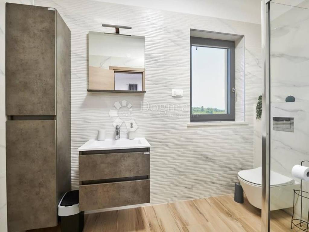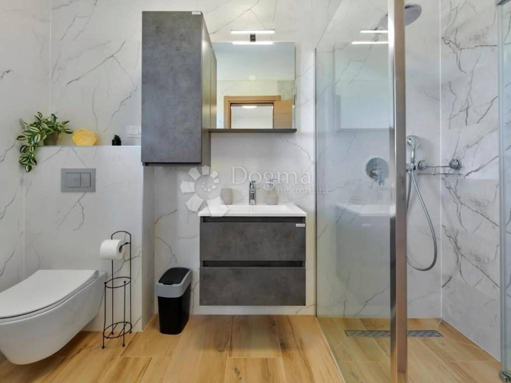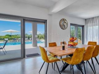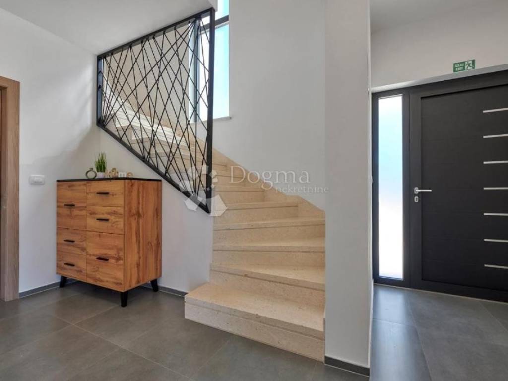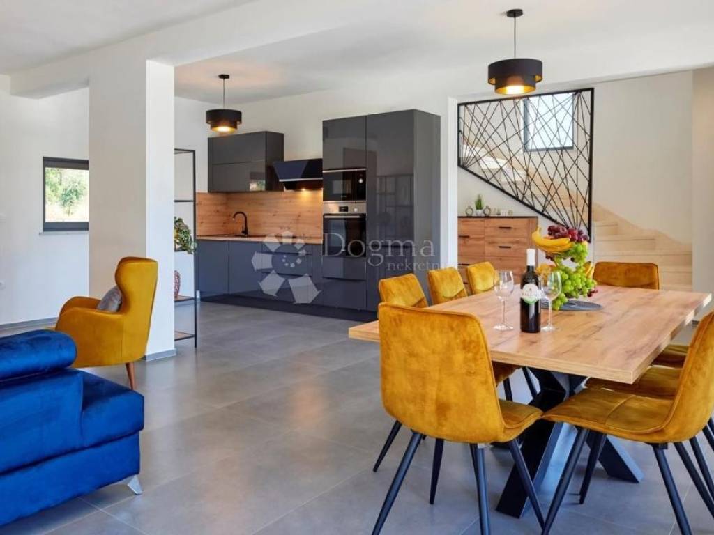U prizemlju se nalazi prostrani dnevni boravak otvorenog koncepta s kuhinjom i blagovaonicom, elegantno uređena kupaonica te izlaz na natkrivenu terasu koja se nastavlja na sunčalište i bazen. Kuhinja je opremljena vrhunskim Bosch aparatima perilicom posuđa, pećnicom, indukcijskom pločom i hladnjakom što osigurava dugotrajnu pouzdanost i maksimalnu funkcionalnost.