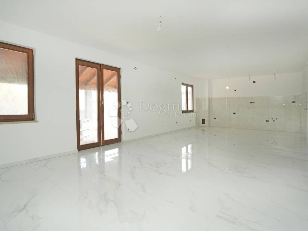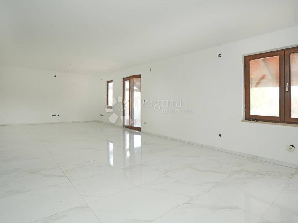 Dnevni boravak nudi pregršt prirodne svjetlosti, a izlaz na natkrivenu terasu od 27 m pruža idealno mjesto za opuštanje ili uživanje u jutarnjoj kavi s pogledom na predivno okruženje.