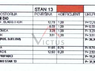 Stan se sastoji od dnevnog boravka s kuhinjom i blagovaonicom, spavaće sobe, kupaonice, te loggie površine 9 m2. Parkirno mjesto u vlasništvu od 12.50 m2
