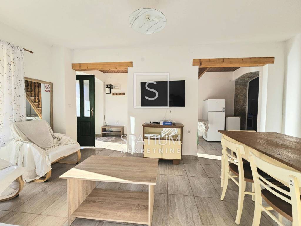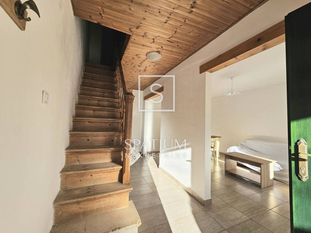 Na prizemnoj etaži nalazi se prostrani dnevni boravak s blagovaonom, jedna soba, kuhinja te kupaona. Stubište vodi na kat gdje se nalaze još tri spavaće sobe te još jedna wc. Sveukupno je 117,5m2 okućnice na kojoj se nalazi "šterna" (spremnik vode) uz uređeno dvorište i prostorom za druženje kao i uređeni parking za jedno vozilo.