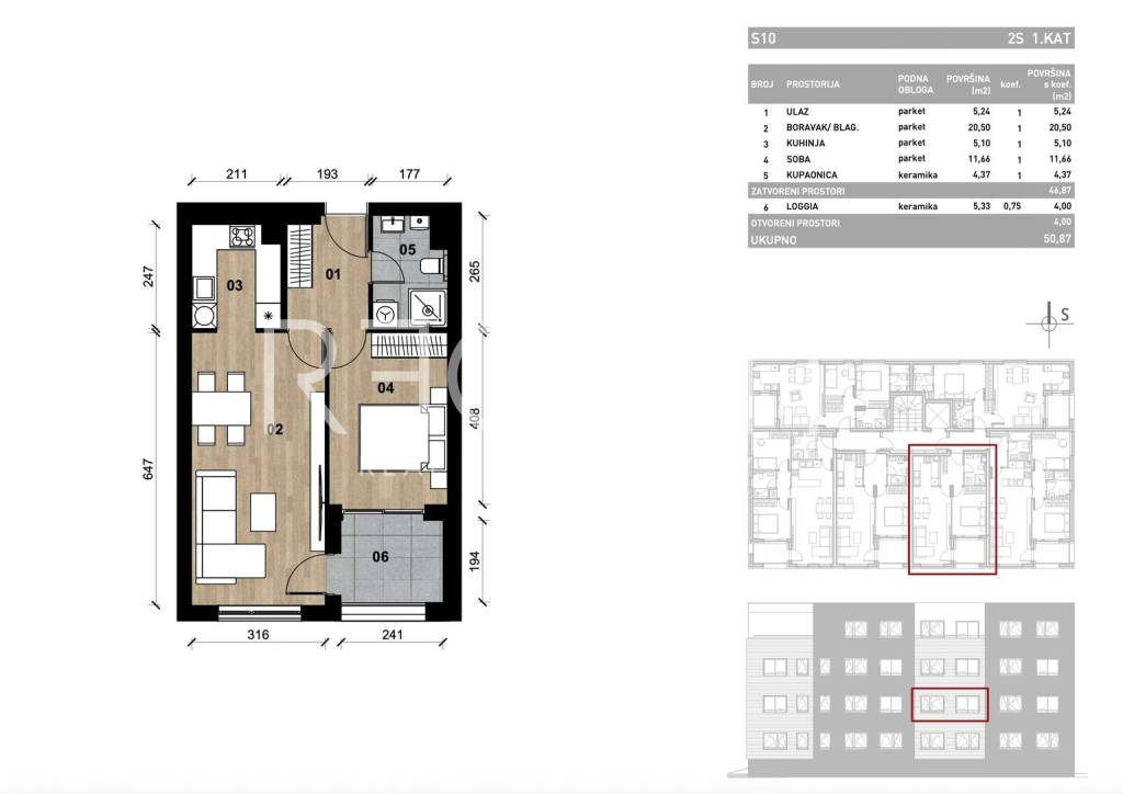 Dvosoban stan smješten je na prvom katu novogradnje u mirnom dijelu Dugava. Idealan je za parove, samce ili investitore koji traže kvalitetno i moderno uređeno mjesto za život u blizini gradskih sadržaja. Stan ima ukupnu neto površinu od 50,87 m² i sastoji se od ulaznog prostora, dnevnog boravka s blagovaonicom, kuhinje, spavaće sobe i kupaonice. Iz dnevne zone izlazi se na loggiu koja omogućuje boravak na otvorenom tijekom cijele godine. Interijer je izveden s parketom od punog hrasta u dnevnim i spavaćim prostorijama te keramikom prve klase u kupaonici i na loggi. Opremljen je drvo-aluminijskom stolarijom s troslojnim staklom, protuprovalnim vratima, videoportafonom, kondenzacijskim plinskim bojlerom Vaillant, radijatorima s termostatskim ventilima i klima uređajem. Smješten u mirnoj ulici u naselju Dugave, stan nudi udobnost i privatnost uz odličnu prometnu povezanost prema centru Zagreba. U blizini su trgovine, škole, vrtići i javni prijevoz, što ovu lokaciju čini vrlo praktičnom za svakodnevni život. Zgrada ima 22 stambene jedinice, lift, garažna i vanjska parkirna mjesta te hortikulturno uređeni okoliš. Energetski je razreda A+, a izgrađena je prema visokim standardima toplinske i zvučne izolacije. Uz svaki stan obvezna je kupnja garažnog ili vanjskog parkirnog mjesta. Spremišta i garažna parkirna mjesta prodaju se zasebno po cijeni od 2.245,00 EUR/m², dok je cijena vanjskog parkirnog mjesta 1.122,50 EUR/m². Za više informacija, slobodno nas kontaktirajte.