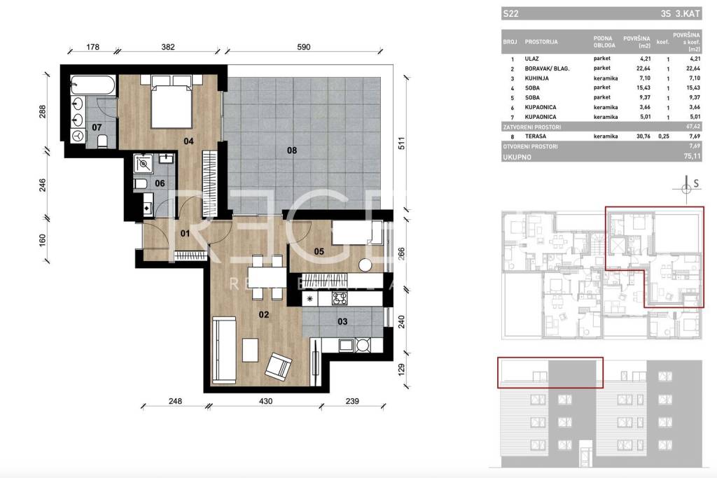 Trosoban stan smješten je na trećem katu novogradnje u mirnom dijelu Dugava. Stan je idealan za obitelji koje traže komforan dom s terasom i obiljem prirodne svjetlosti, u zgradi modernog dizajna i vrhunske izvedbe. Stan ima ukupnu neto površinu od 75,11 m² i sastoji se od ulaznog prostora, dnevnog boravka s blagovaonicom, kuhinje, dvije spavaće sobe te dvije kupaonice. Iz dnevnog dijela izlazi se na prostranu terasu koja nudi dodatan prostor za odmor i druženje. U interijeru je postavljen hrastov parket u svim dnevnim i spavaćim prostorijama, dok su kupaonice i terasa obložene keramikom prve klase. Stan je opremljen drvo-aluminijskom stolarijom s troslojnim staklom, protuprovalnim vratima, videoportafonom, kondenzacijskim plinskim bojlerom Vaillant, radijatorima s termostatskim ventilima i klima uređajem. Lokacija u Ulici Kramarići pruža mir i privatnost, uz brzu povezanost s glavnim prometnicama, gradskim središtem i obilaznicom. U neposrednoj blizini nalaze se škole, vrtići, trgovine i javni prijevoz, što ovu adresu čini izvrsnom za obiteljski život. Zgrada ima ukupno 22 stambene jedinice, lift, garažna i vanjska parkirna mjesta te hortikulturno uređeni okoliš. Energetski razred zgrade je A+, a u gradnji su korišteni vrhunski materijali i sustavi koji jamče udobnost i trajnost. Uz svaki stan obvezna je kupnja garažnog ili vanjskog parkirnog mjesta. Spremišta i garažna parkirna mjesta prodaju se zasebno po cijeni od 2.245,00 EUR/m², dok je cijena vanjskog parkirnog mjesta 1.122,50 EUR/m². Za više informacija, slobodno nas kontaktirajte.