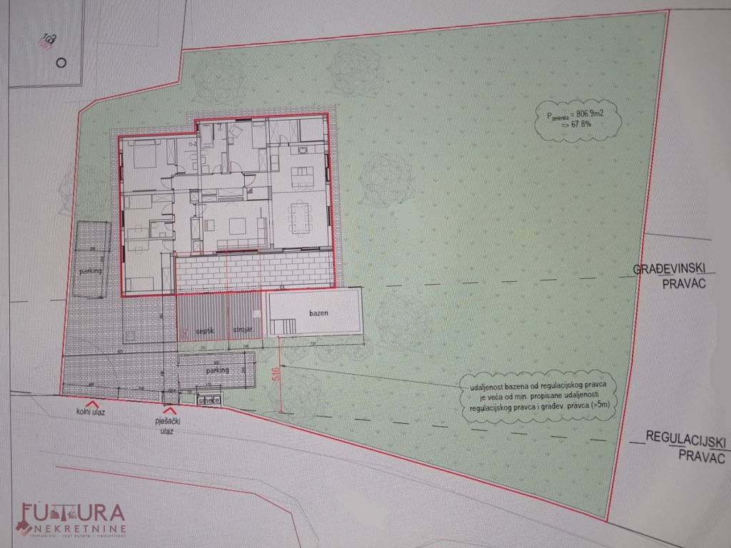 Zemljište posjeduje projekte za obiteljsku kuću od cca.150 m2 + bazen i gusterna te je predan zahtijev za građevinsku dozvolu koja se očekuje ubrzo.