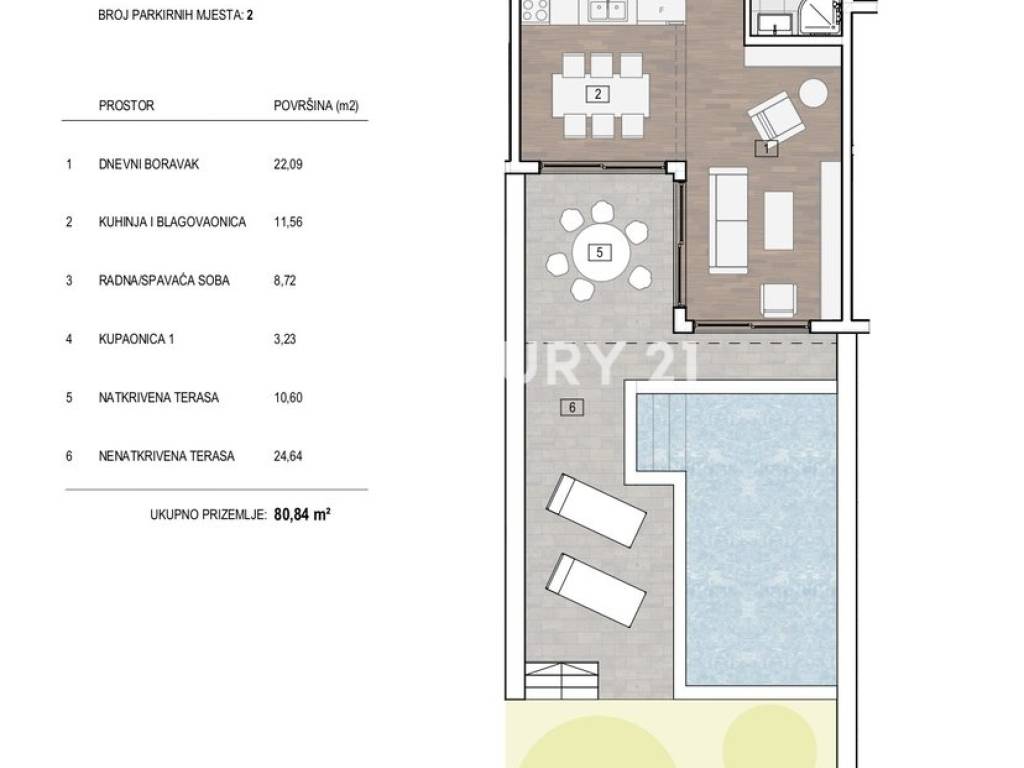 - Nenatkrivena terasa uz bazen (24,64 m2)