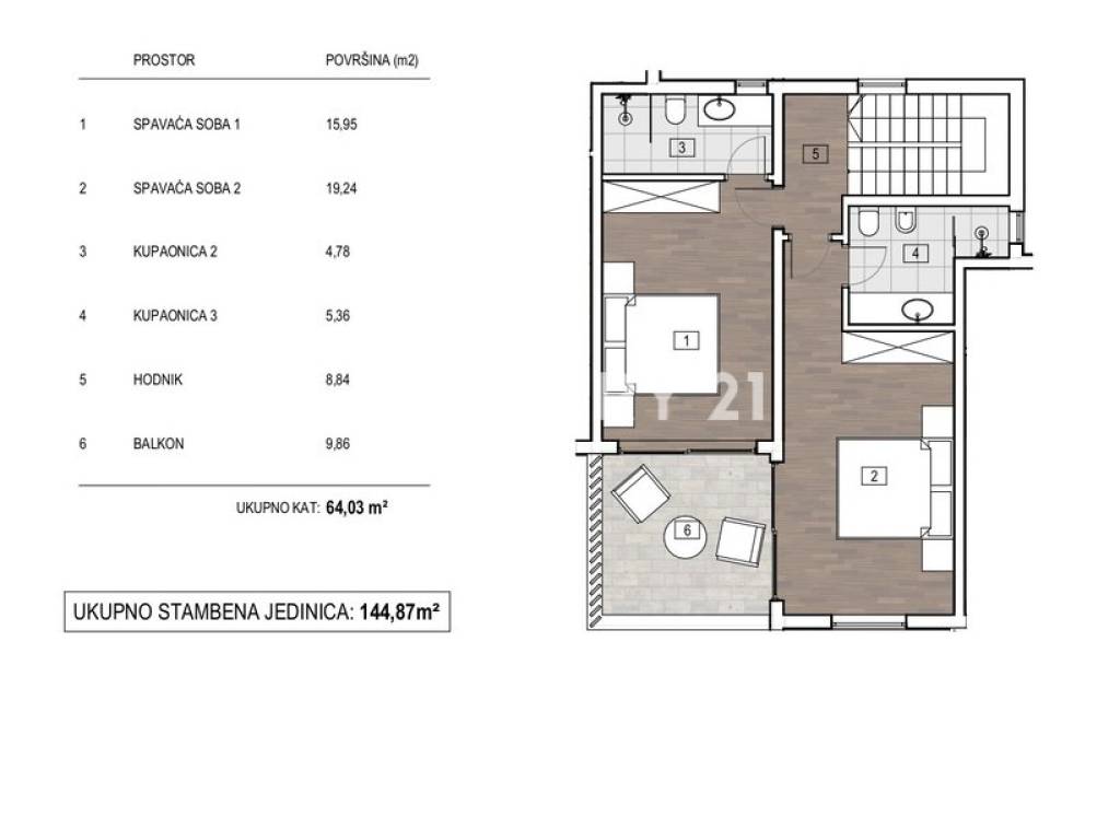 - Dvije spavaće sobe: prva soba (15,95 m2) s vlastitom kupaonicom (4,78 m2) i druga soba (19,24 m2) s dodatnom kupaonicom (5,36 m2)