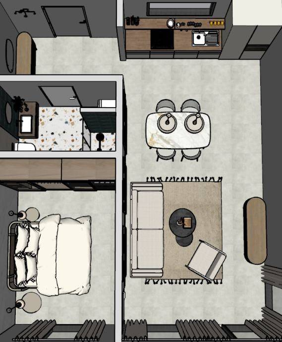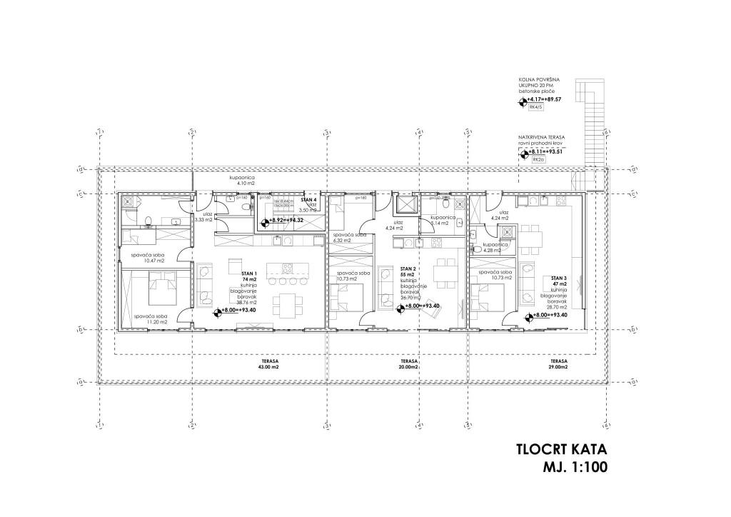 Sastoji se od “open space” dnevnog boravka s kuhinjom i blagovaonicom, izlazom na terasu, 2 spavaće sobe, 1